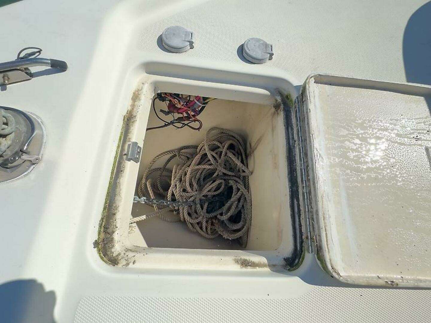 Aft of the engine room hatch is a deck access that hosts the batteries, DC panel with battery switches, and the rudder assembly.