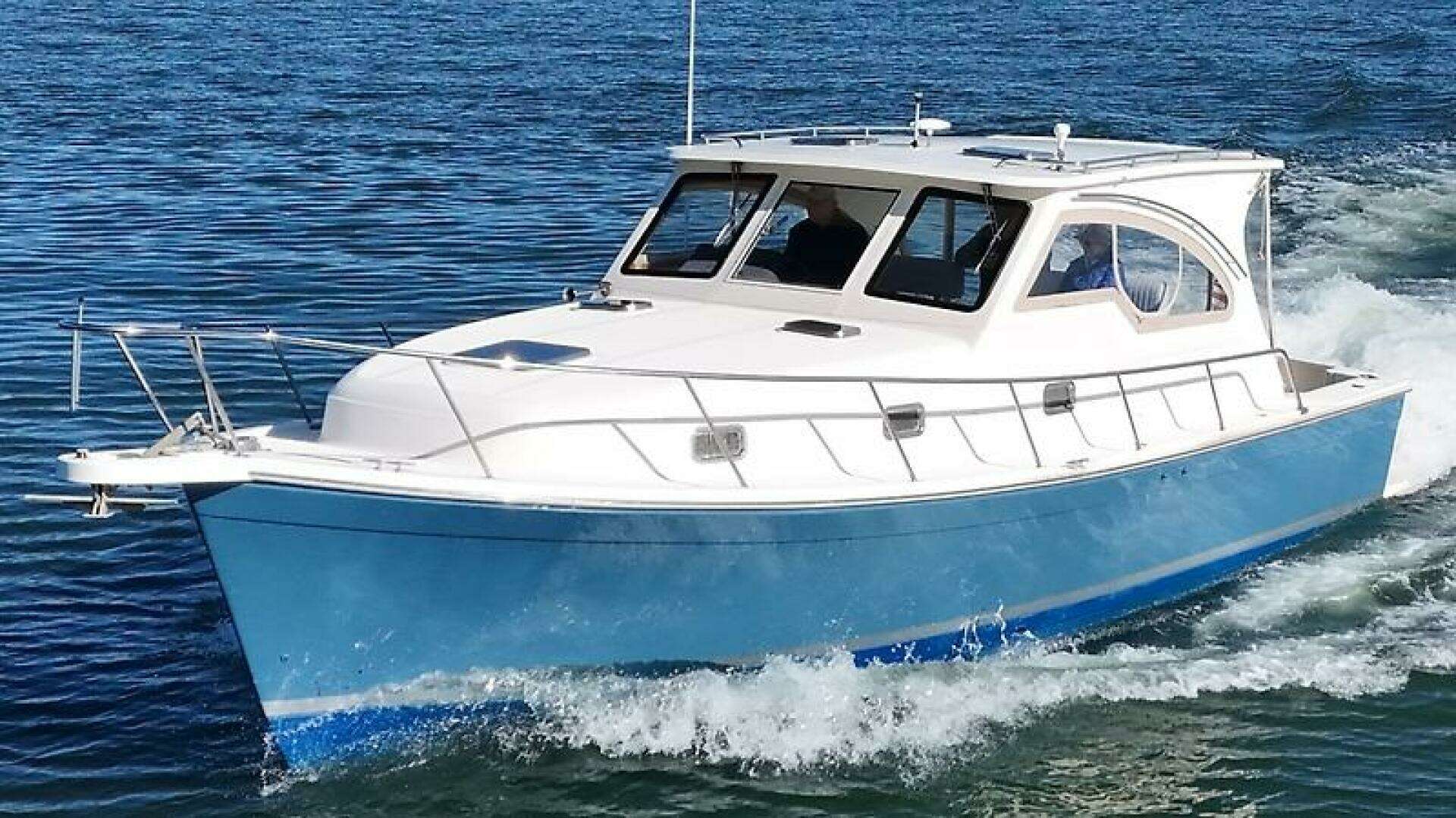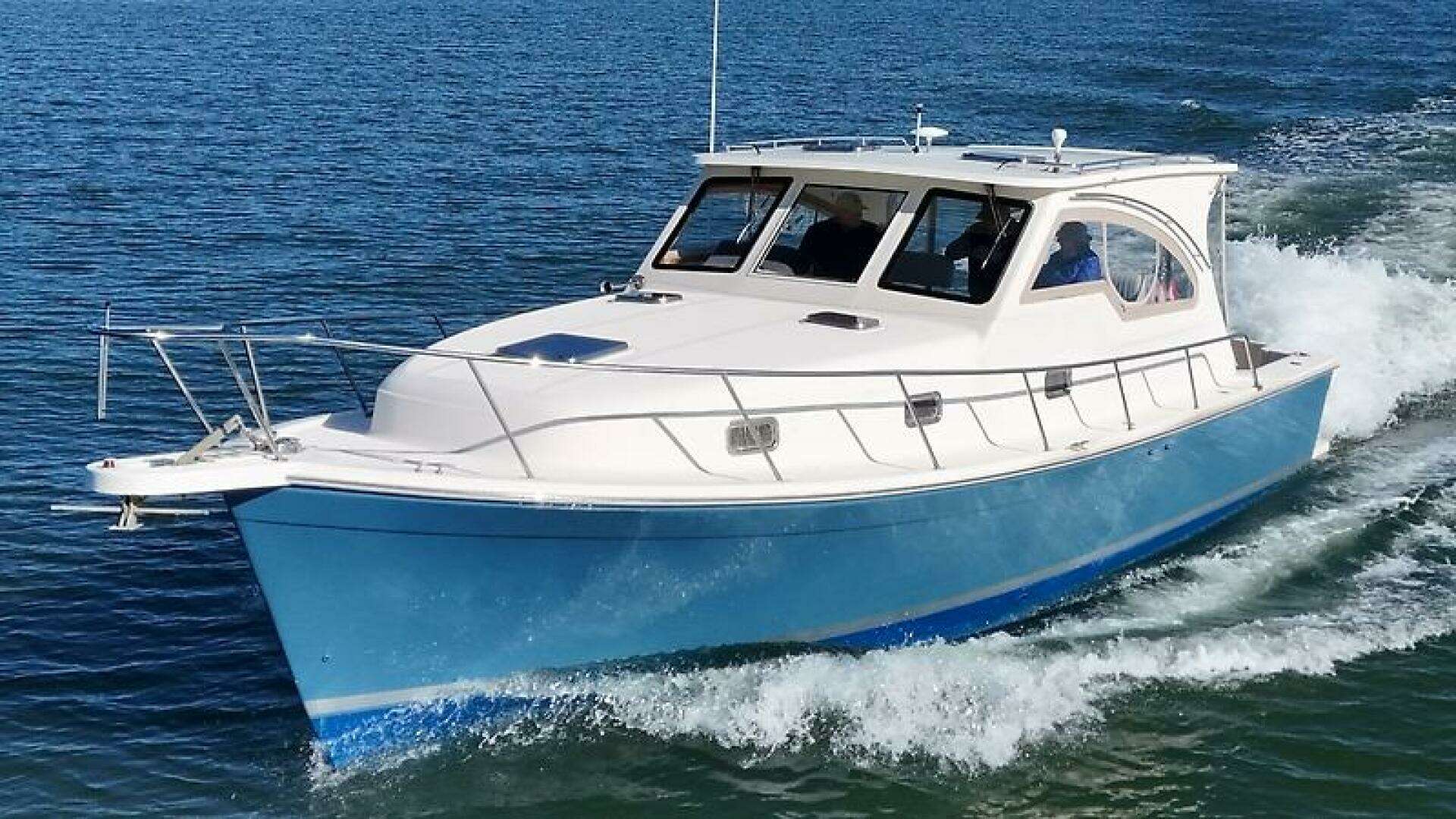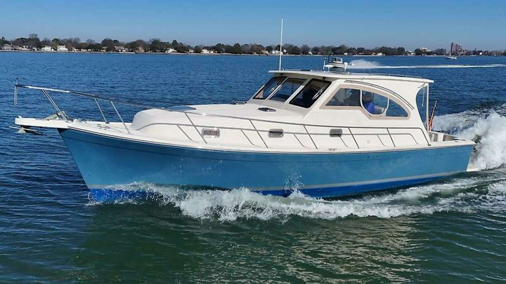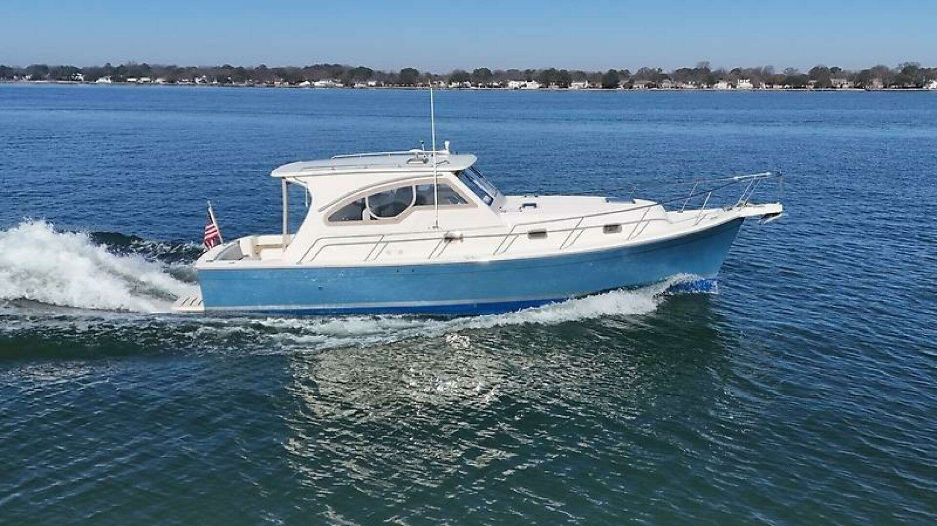 The Mainship 34 Pilot is an enlarged version of the super popular Mainship 30 Pilot, a versatile (and affordable) Down East cruiser introduced by Mainship in 1998. Where the 30 Pilot is essentially a day boat, the larger interior of the 34 provides the volume required for extended cruising. The first 34 Pilots were express models; in 2001, the Sedan version with an extended hardtop offered owners the added security of a semi-enclosed pilothouse. The well-appointed accommodations consist a roomy main salon with full-service galley and convertible dinette, enclosed head with shower, and a single stateroom forward with bi-fold privacy door. A TV on a swivel platform is mounted forward in the cabin. In the cockpit, facing bench seats behind the helm and companion seats can double as extra berths. A centerline hatch in the cockpit sole provides access to the engine. Additional features include a standard bow thruster, tilt-away helm, transom door, and wide side decks. The 34 rides on a semi-displacement hull with moderate beam and a deep keel. A single 350hp Yanmar diesel will cruise at 14 knots (16–18 top). Twin 240hp Yanmar diesels cruise at 18 knots.