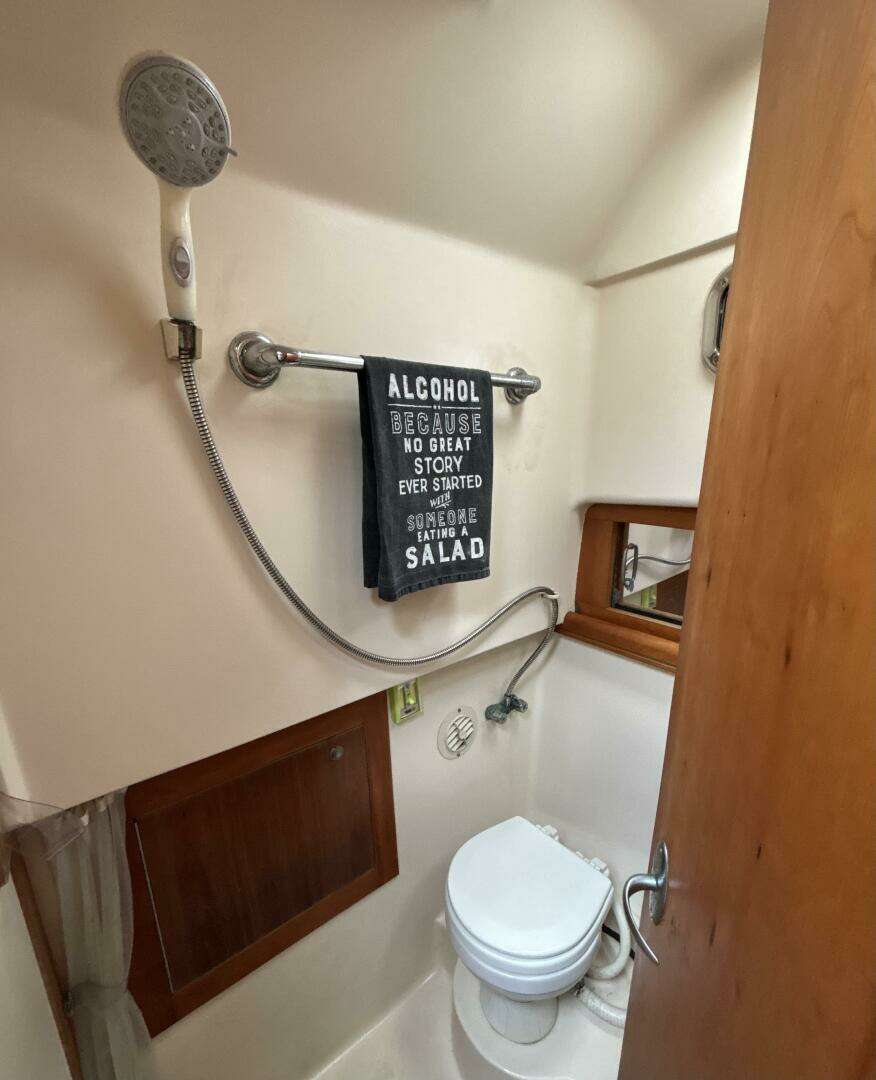 The interior of the Mainship 34 Rum Runner II is designed for comfort and practicality, finished with warm wood accents, a teak and holly sole, and stainless steel opening ports that provide excellent light and ventilation. Forward, the owner’s stateroom offers a generous berth with abundant storage. To starboard, the convertible settee is upholstered in Ultraleather and offers additional seating and sleeping accommodations. To port, the galley is well arranged with hot and cold pressure water, a stainless steel sink, solid-surface countertop, and ample storage for extended cruising. A spacious wet head is also located to port, equipped with an electric flush marine toilet, shower, and vanity with sink.