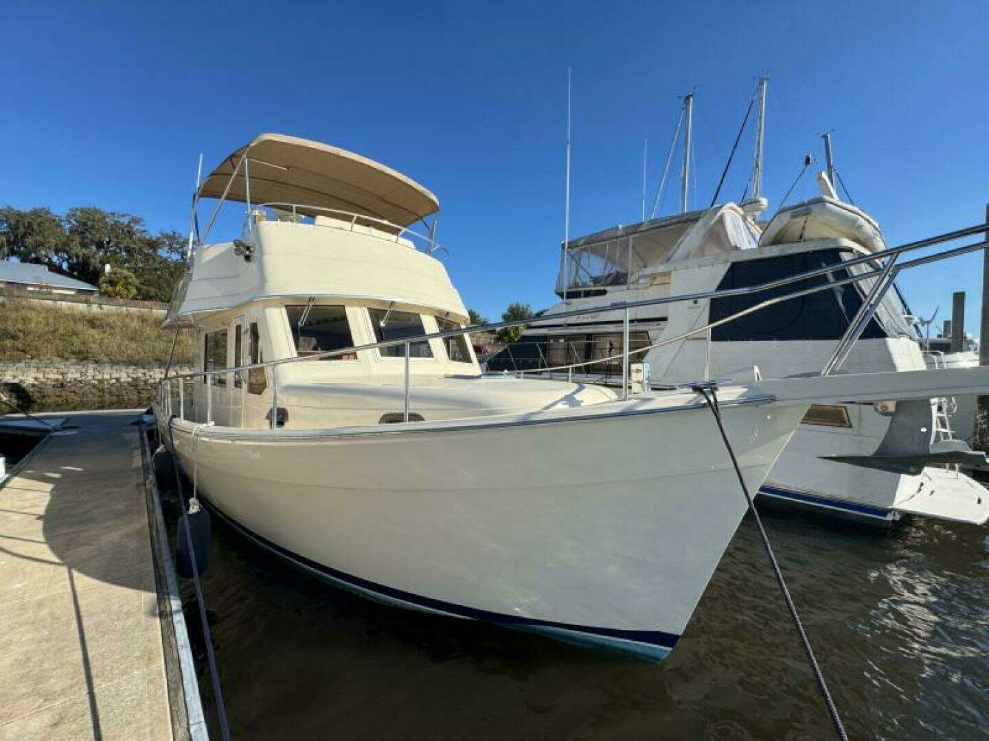 | Notable Upgrades: New Raymarine Electronics (March 2025) New Fusion Stereo and speakers (March 2025) New Flybridge Helm Seats (March 2025) New Salon Upholstery (January 2025) New Generator Battery (January 2025) New Bottom Paint (January 2024) Updated Canvas (2021) Salon A/C (2019) |
