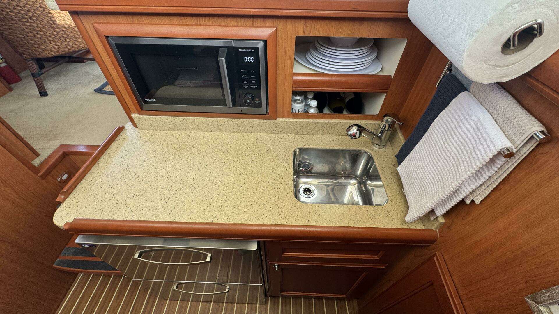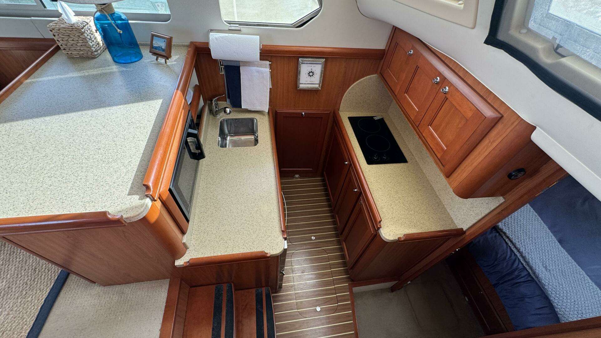 Galley The galley on Side Trip is thoughtfully designed for meal preparation during extended cruises. With modern amenities and ample storage, it’s equipped to handle everything from quick snacks to gourmet meals.