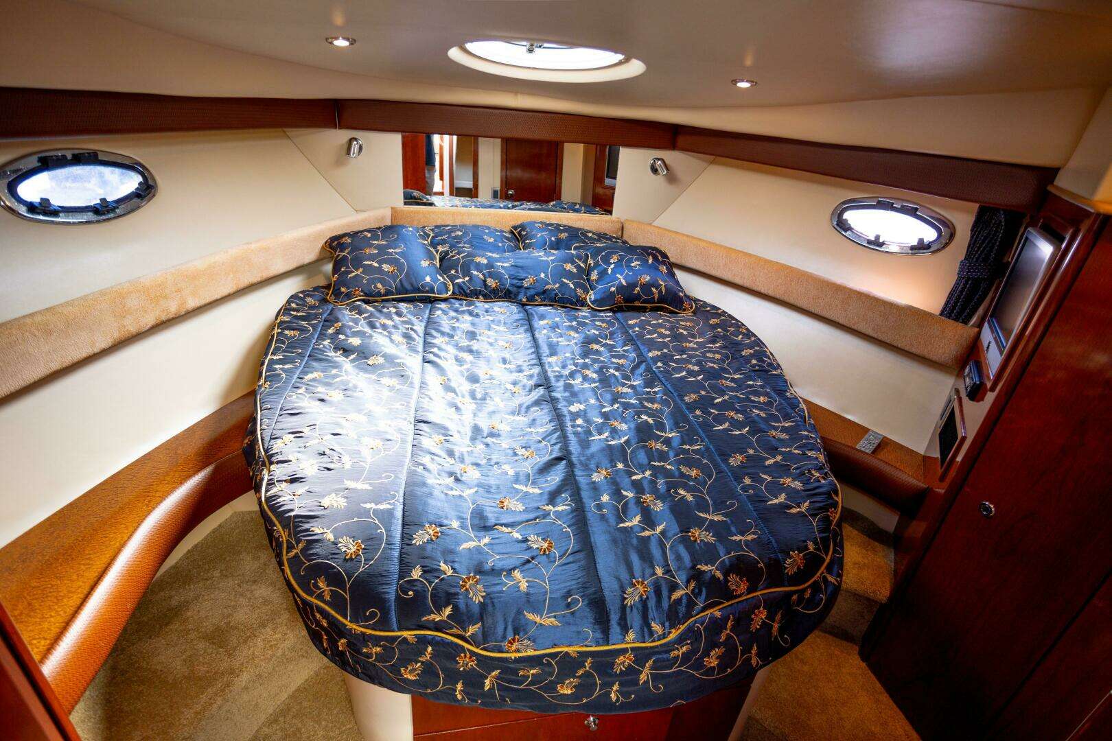 - Salon entertainment system: flat-screen TV, DVD, AM/FM stereo with cabin & flybridge speakers