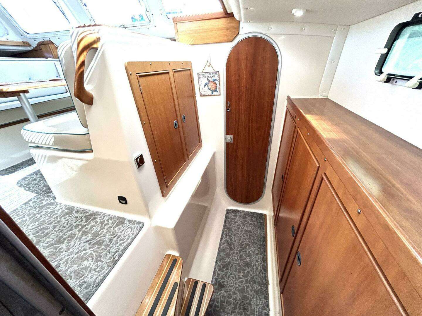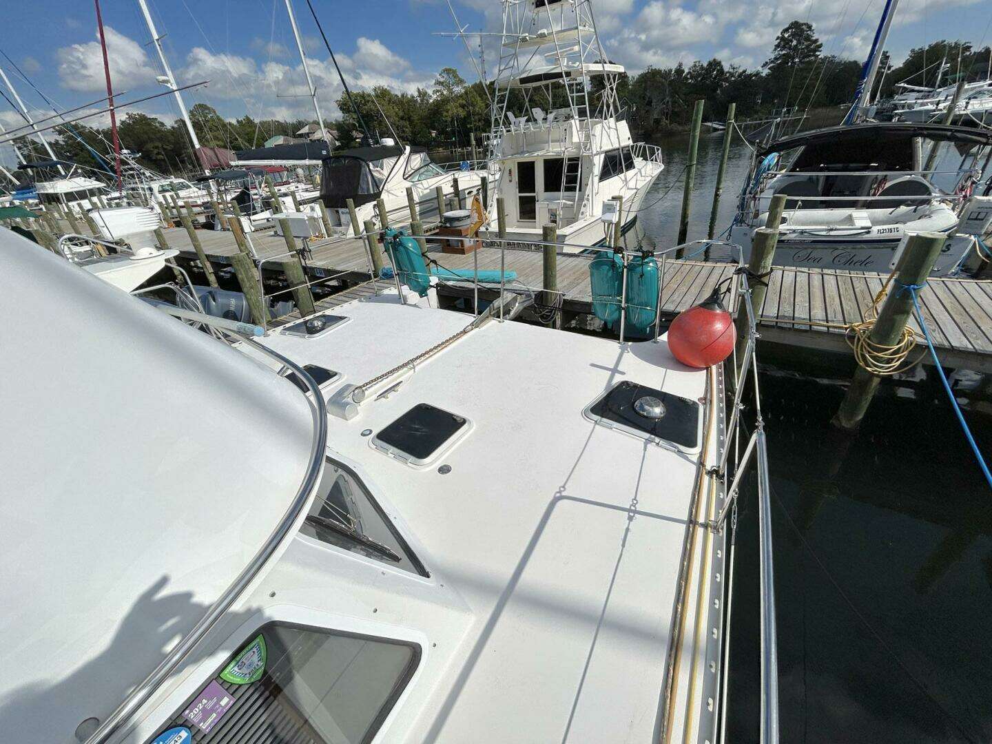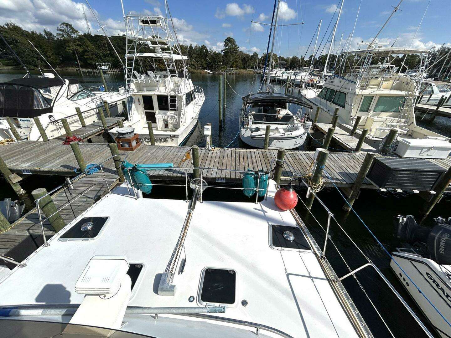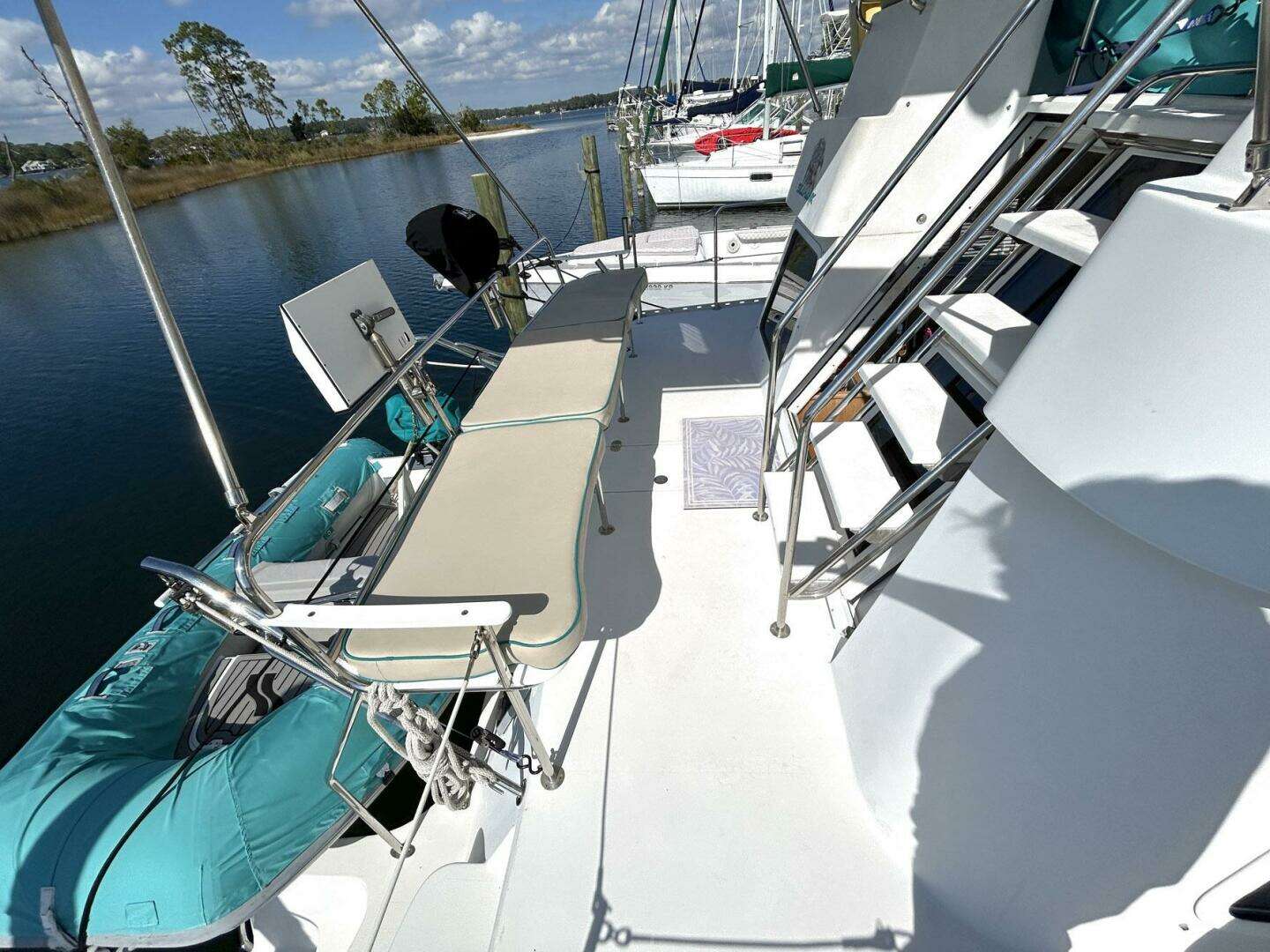 This beautiful Power Cat Trawler shows like a new boat. She is absolutely immaculate and has been kept up to date by her very attentive owners. Cruise or live-aboard, this is a boat that actually solves the space problems you've noticed on other boats. The Passage Maker is a "CAT", so you won't find odd shaped nooks and crannies like other boats but what you will find are two cabins large enough to hold queen size beds, loads of storage space, extensive interior light and lots of ventilation throughout. The salon/dinette area (solid wood cabinets throughout) seats six or more comfortably and the lower helm is positioned nicely for the Captain to join in on any socializing. The flybridge is quite large and accessible via stairs from the cockpit. The deck area has grab rails everywhere and the walkways are wide enough for two people to pass one another easily. And docking is a breeze with a sharp turning radius! This is an extremely well kept Passage Maker and is rarely seen on the market with these incredible features.
