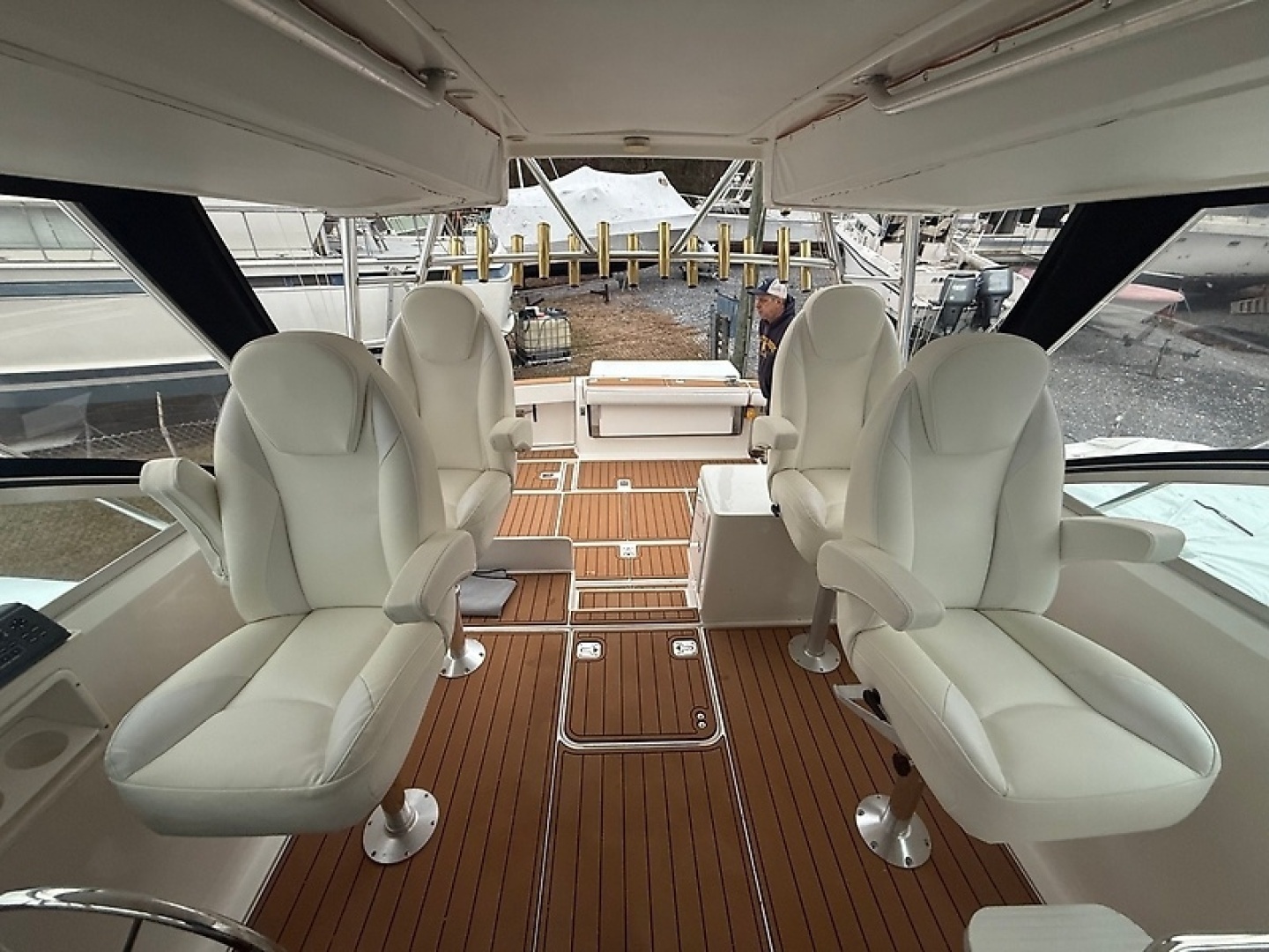 The bridge deck features four custom helm chairs designed for maximum comfort during long runs or tournament days, providing ergonomic support and excellent visibility.