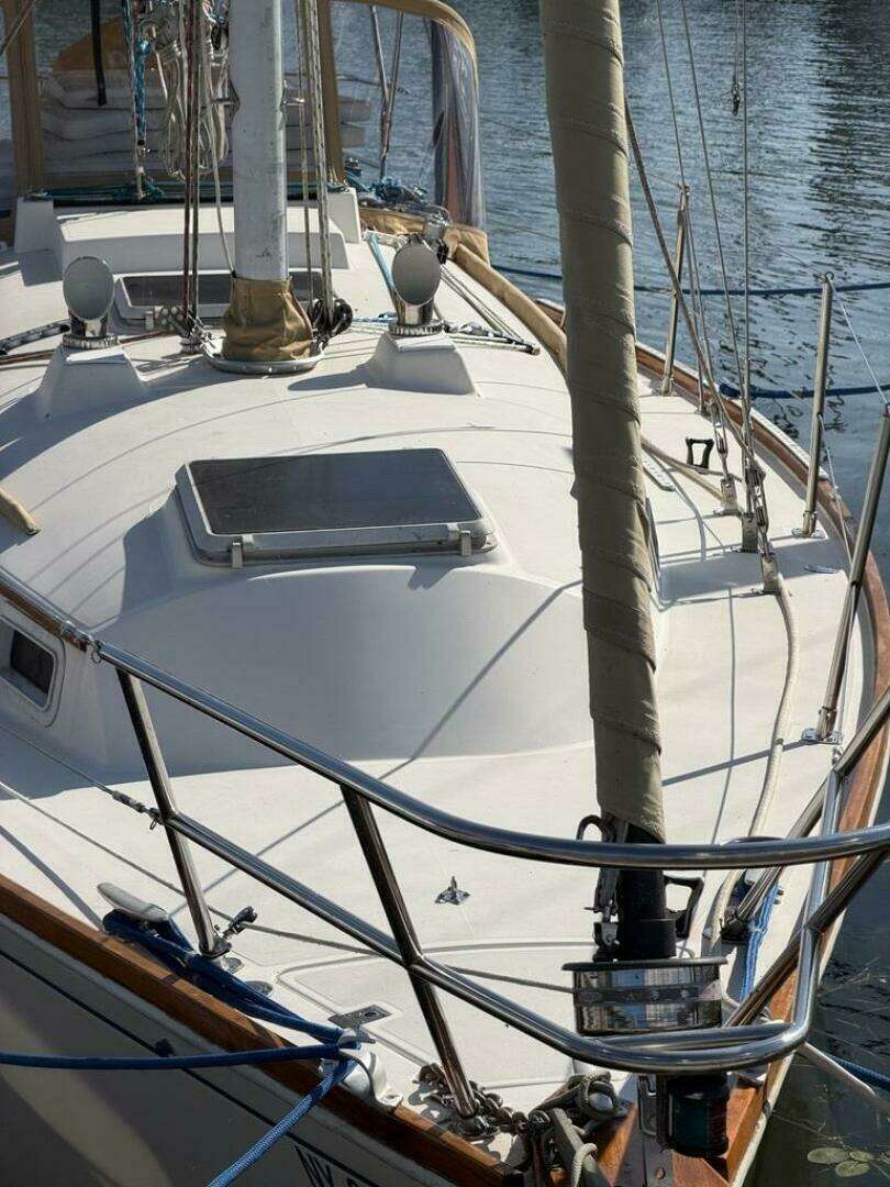 Below deck, the interior shows beautifully with warm teak cabinetry and joinery in exceptional condition. The layout includes a spacious forward V-berth, a comfortable main salon with port and starboard settees, and a generous centerline folding table. The full galley is equipped with ample storage, a deep sink, and a two-burner stove. A private head with marine toilet and sink is located to port, with a large hanging locker opposite. A roomy quarter berth aft provides excellent sleeping accommodations or convenient storage.