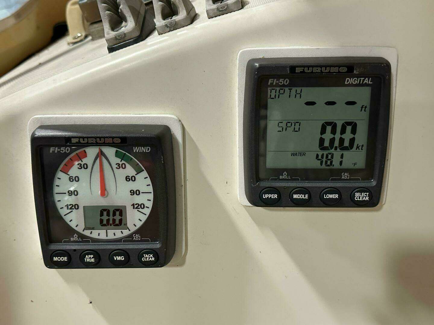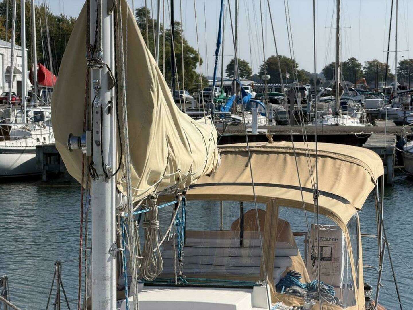 Tankage includes approximately 38 gallons of freshwater and about 20 gallons of fuel, giving the boat solid cruising range and convenience for weekends aboard. The boat features a very nice full canvas package—recent bimini, dodger, and connector—providing protection and extended cockpit comfort. Newer instruments round out the helm area, offering clear, reliable navigation and sailing data.