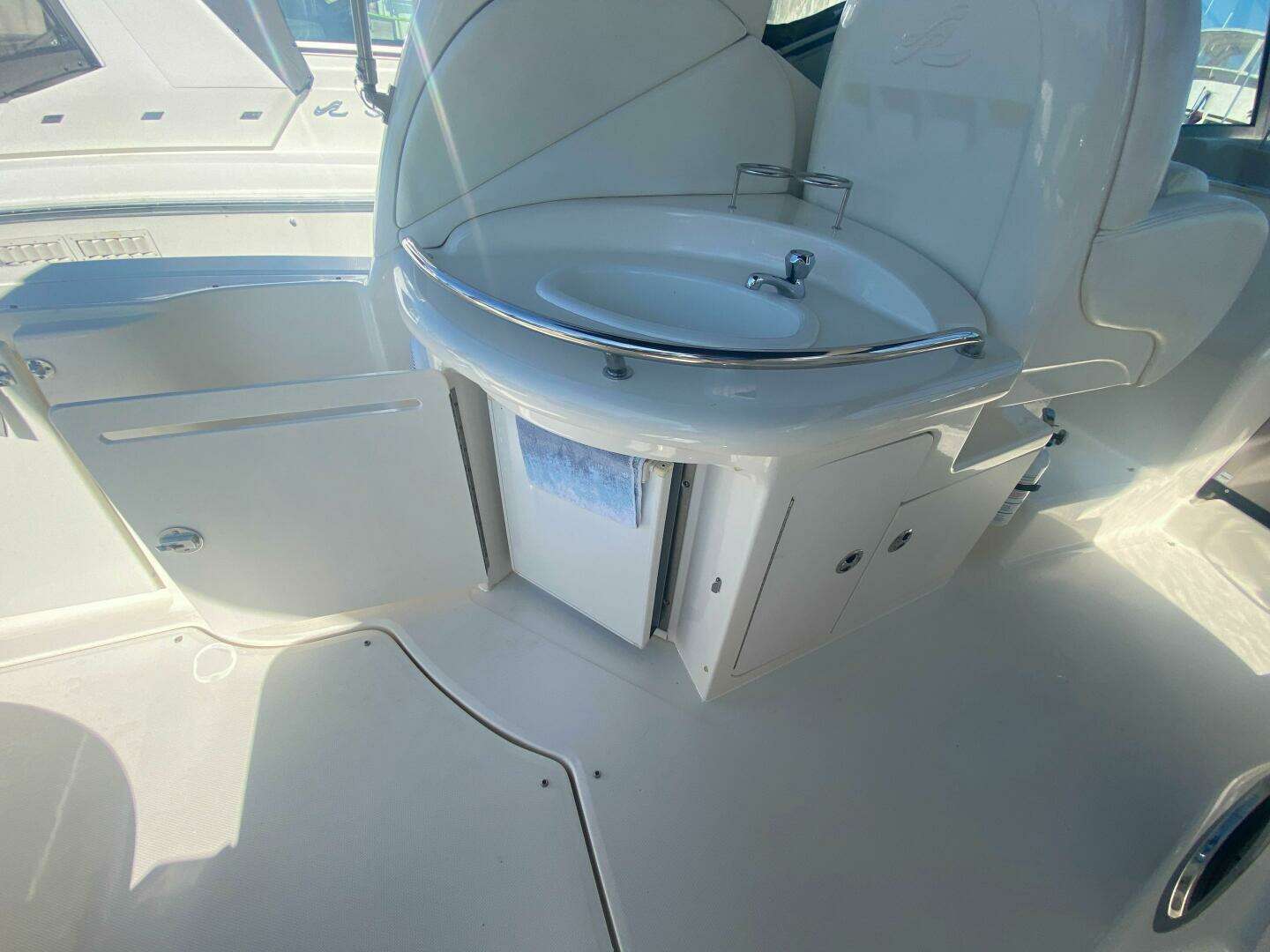 2003 Sea Ray 340 Sundancer – Classic Express Cruiser with Timeless Style The Sea Ray 340 Sundancer has long been one of the most popular express cruisers on the water, thanks to her spacious layout, dependable performance, and signature Sea Ray styling. This 2003 model blends comfort and versatility, making it an ideal choice for both day cruising and extended weekends aboard. Powered by twin MerCruiser inboards, the 340 Sundancer offers smooth handling and reliable performance. The cockpit is designed for entertaining, with generous U-shaped seating, a wet bar, and a double helm seat with excellent visibility. A large swim platform makes boarding easy and is perfect for water sports or relaxing at anchor. Below deck, the cabin is bright and open with cherry cabinetry, premium finishes, and a practical layout. The forward island berth provides a comfortable space for overnighting, while the mid-cabin converts easily for additional sleeping or lounging. The galley is well-equipped with refrigerator, cooktop, microwave, and sink, while the enclosed head includes a VacuFlush® toilet and shower. The 2003 Sea Ray 340 Sundancer is a proven favorite for boaters who want a balance of style, comfort, and performance. With her inviting accommodations and solid build, she’s ready to deliver countless memories on the water.