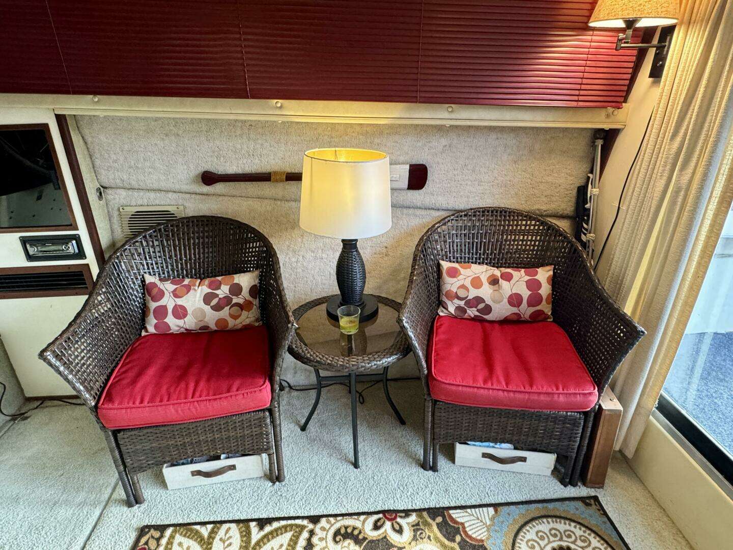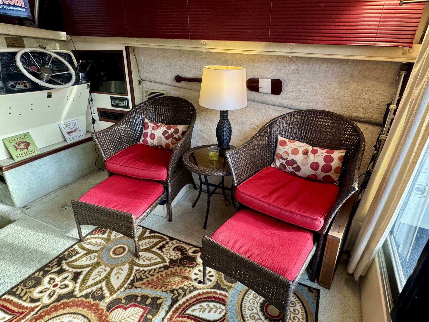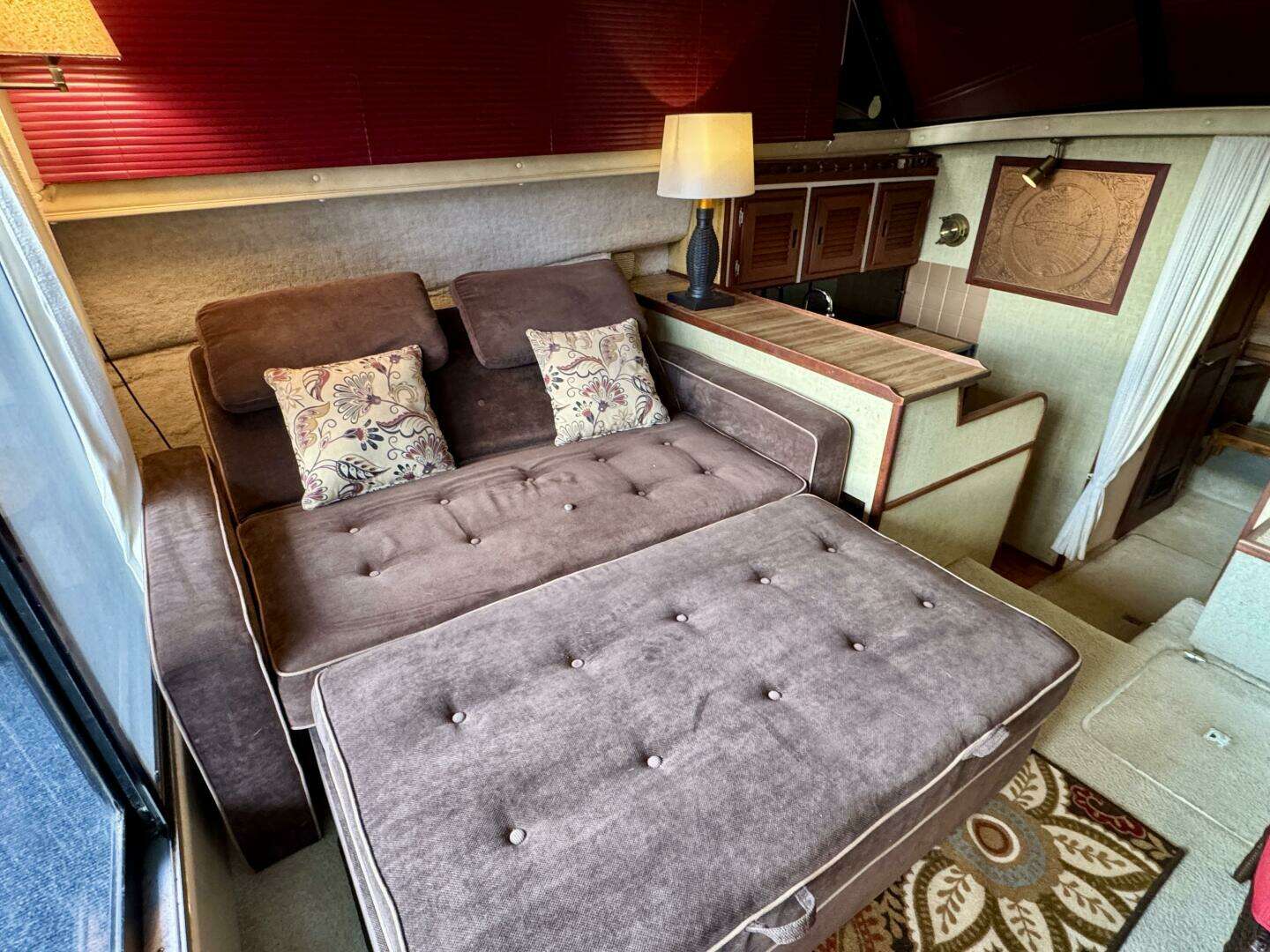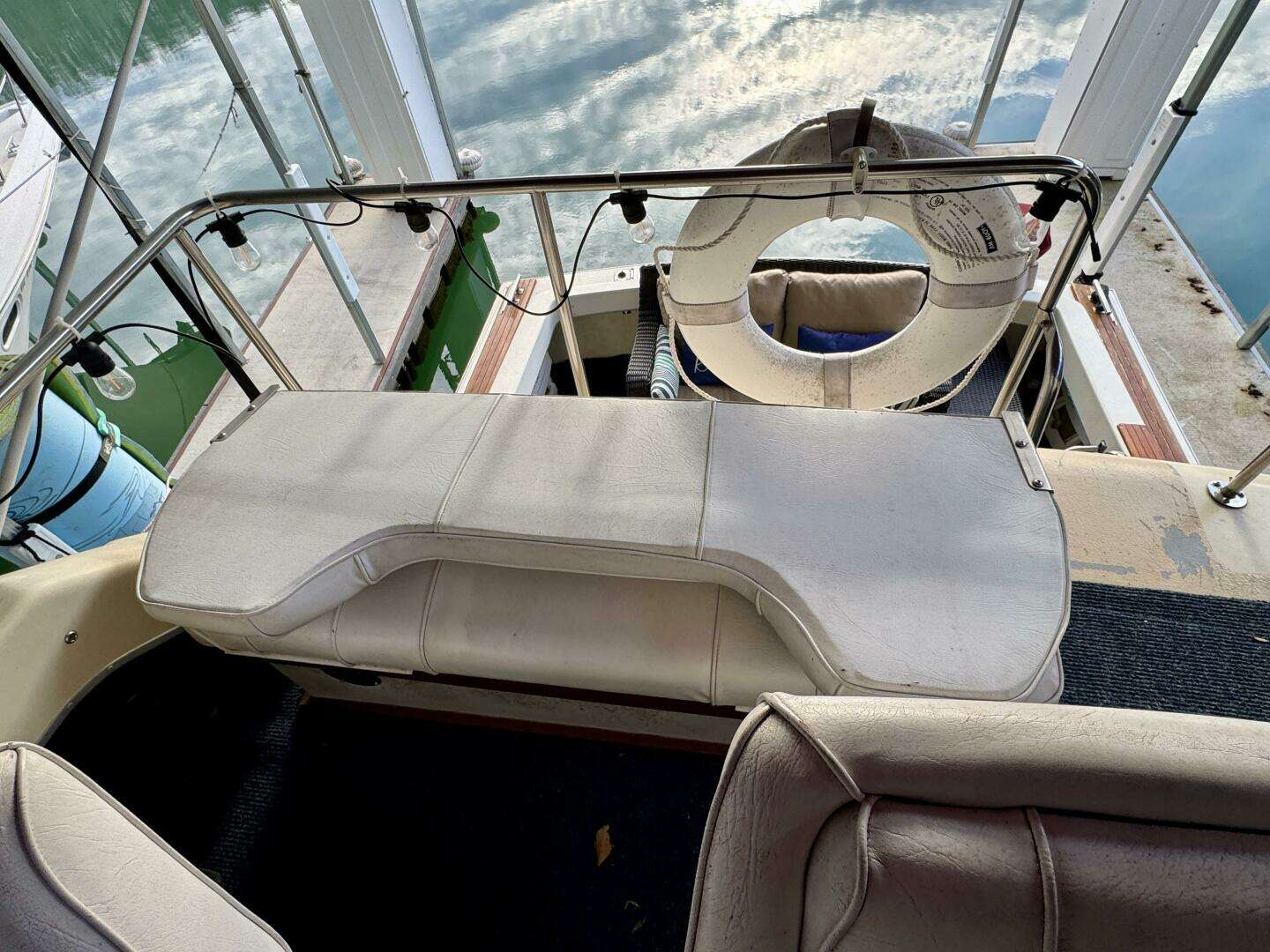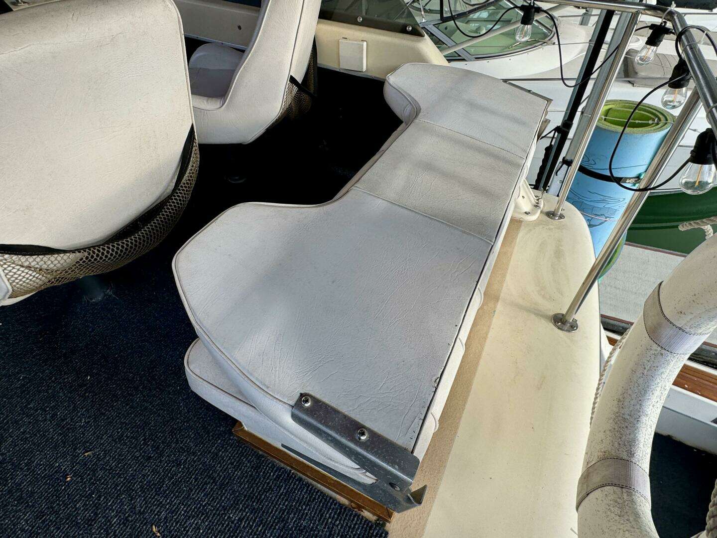 Entering from the cockpit you'll find an inviting patio loveseat to the stern that sits above the engine hatches housing the twin Crusader 350 inboard engines with warner velvet drive transmissions, an onboard battery charger, electric water heater, the fresh water and waste holding tanks, and more. At the transom you'll also find a rod-holder mounted Magma gas grill that's occupying one of two integrated rod holders and the integrated swim platform just beyond it with a 2-step swim boarding ladder.