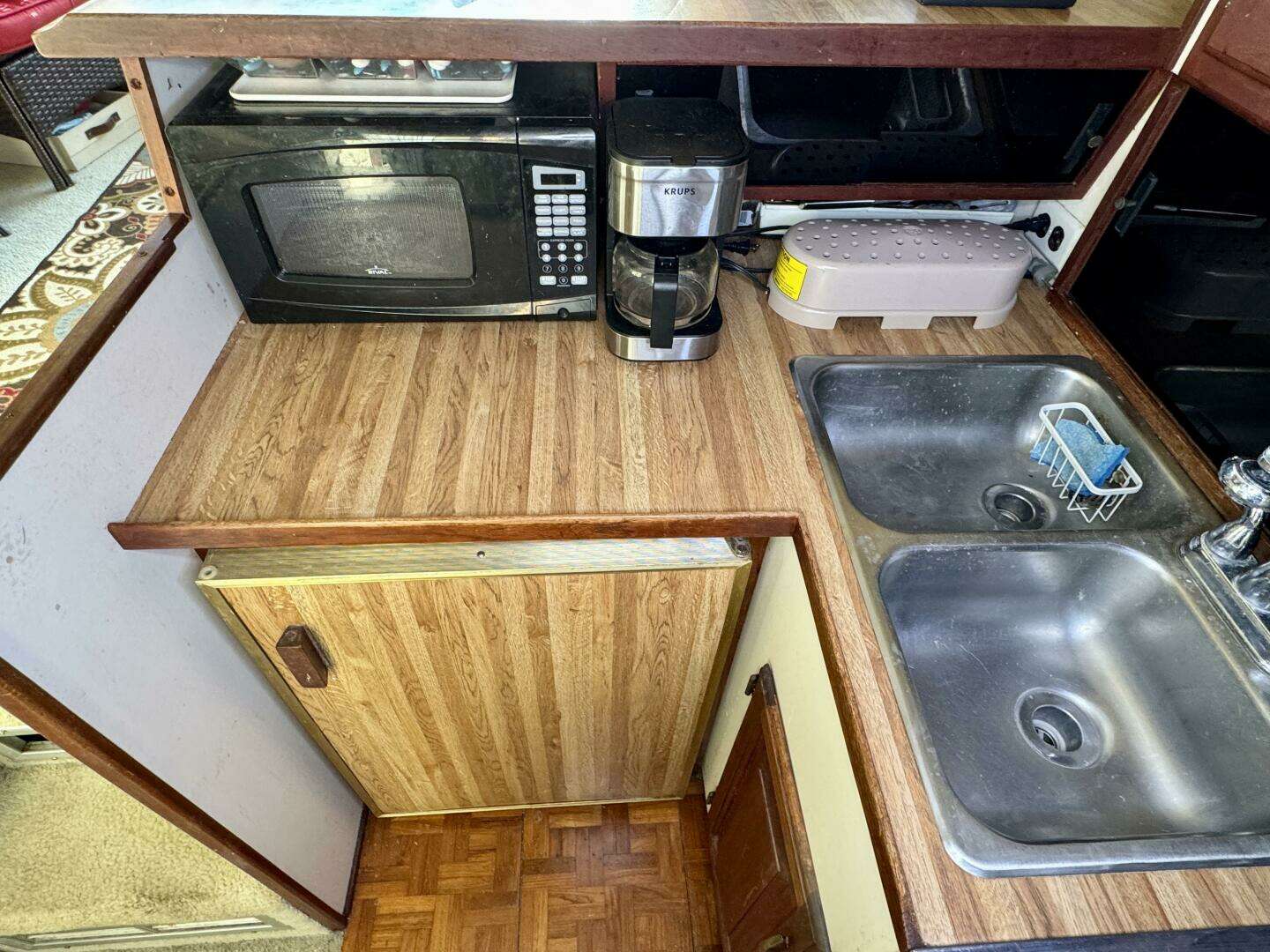 Just forward of the lower helm and to port 2 steps will take you down to the galley that's equipped with an AC/DC refrigerator, microwave, coffee maker, princess electric 2-burner range top, double stainless sink, and integrated cabinets with a perko floor.