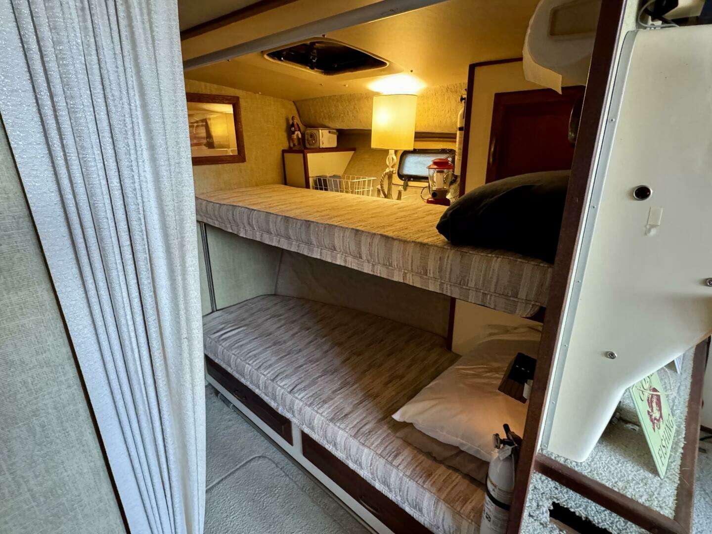 Forward and to starboard from the galley, perhaps behind a privacy curtain if your crew is napping, you'll find a large settee that converts to a bunk bed with a port window at the top bunk and 12volt reading lights at each bunk.