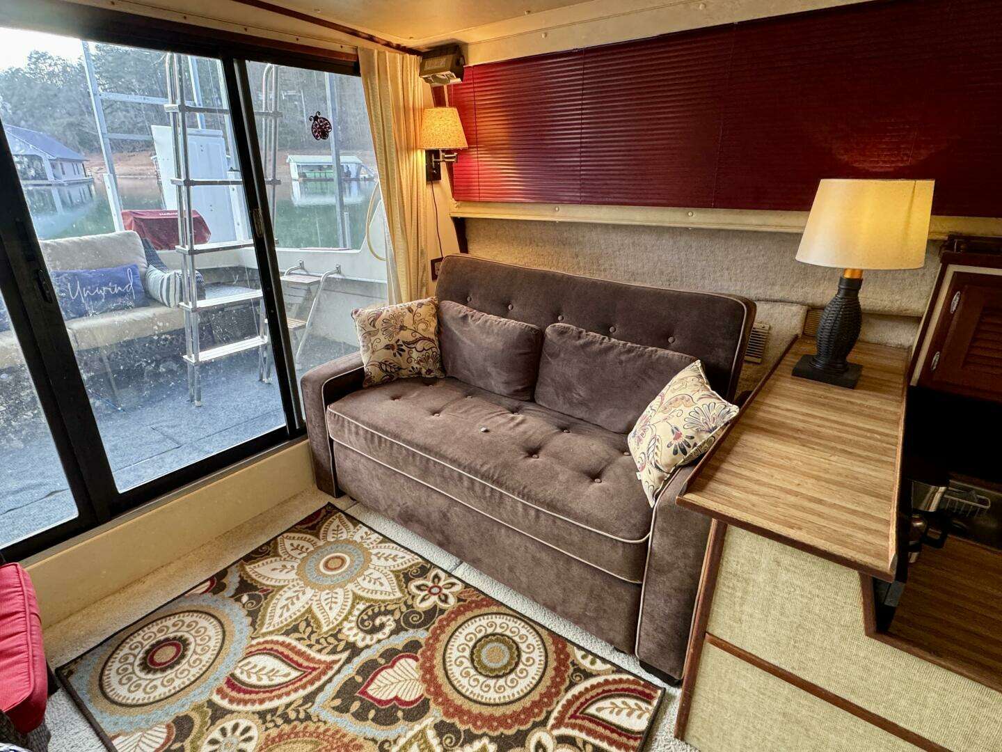 Returning to the cockpit you can enter the cabin easily through the sliding door where you'll find a convertible sofa to the port and a pair of wicker deck chairs to starboard and the lower helm just forward on the starboard side. The stereo is mounted at the lower helm along with controls for the 16K BTU marine air conditioning unit with reverse cycle heat.