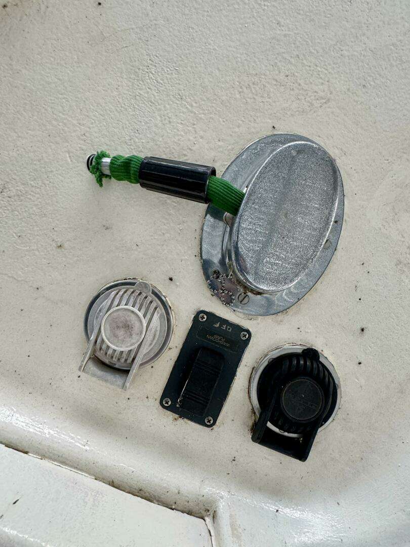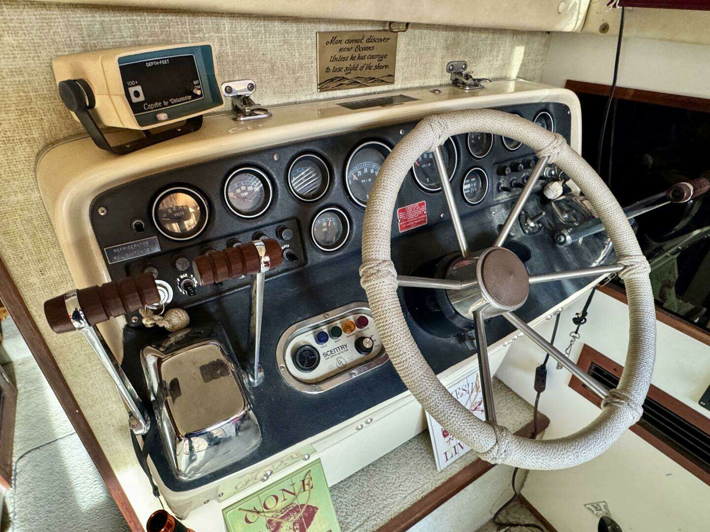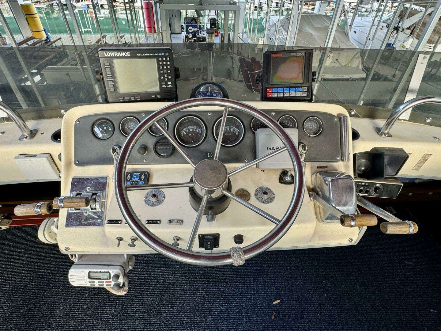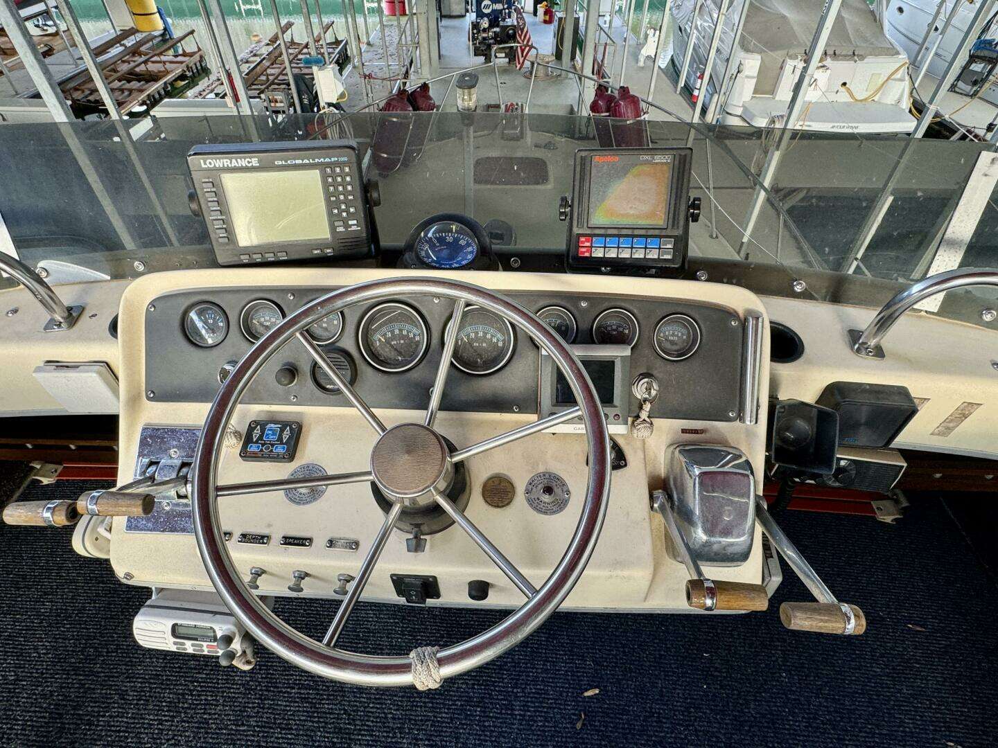 Lower Helm Gauges: Fuel & Hour Meter, Port/Starboard – Battery Volts, Engine Temp. Engine Oil Press., & Tachometer, plus Scentry Gas Vapor Detector, Judson Engine Synchronizer, Icom VHF Radio, 12Volt Outlet,