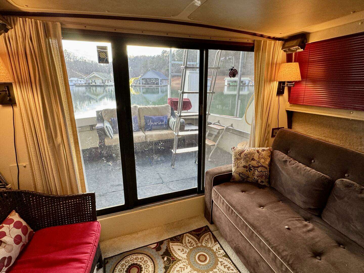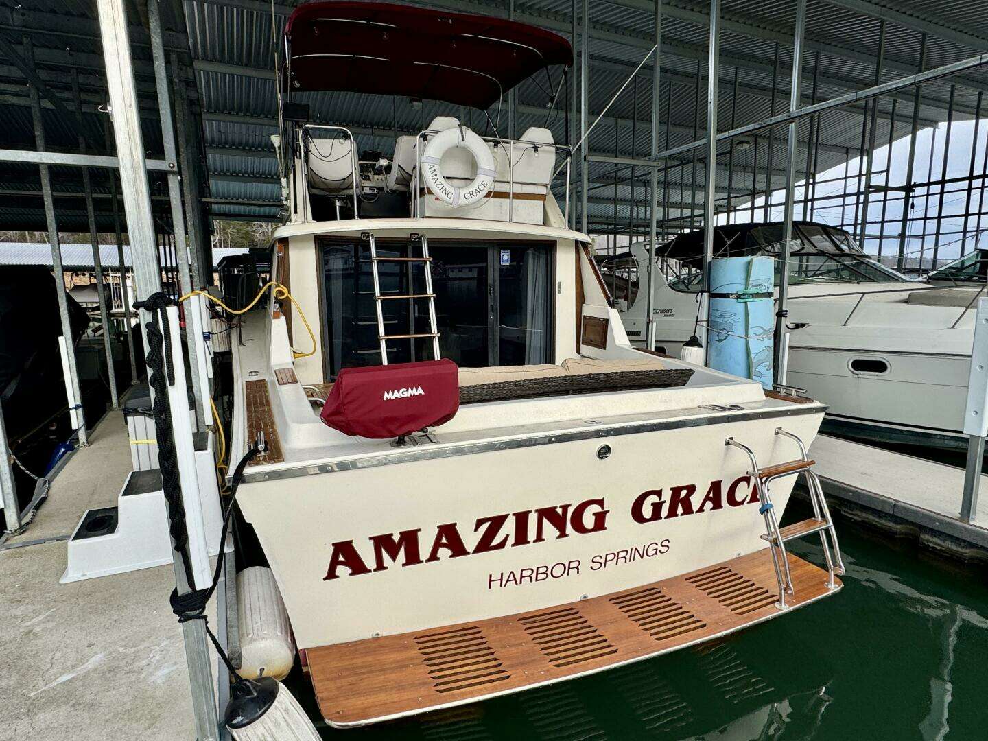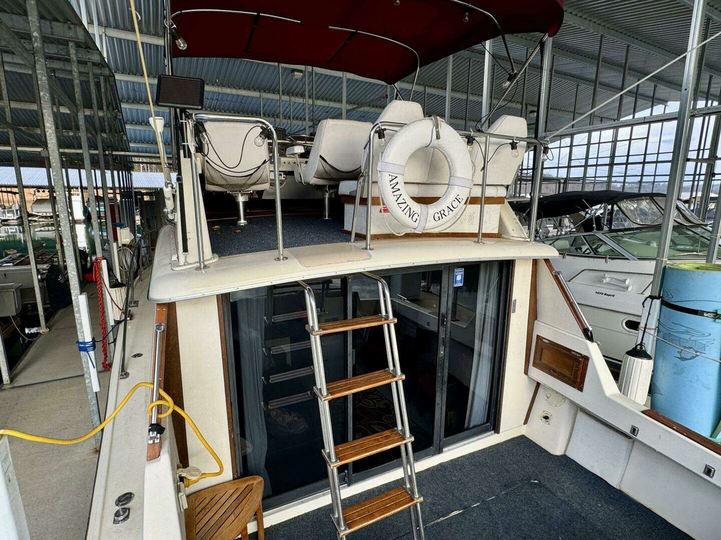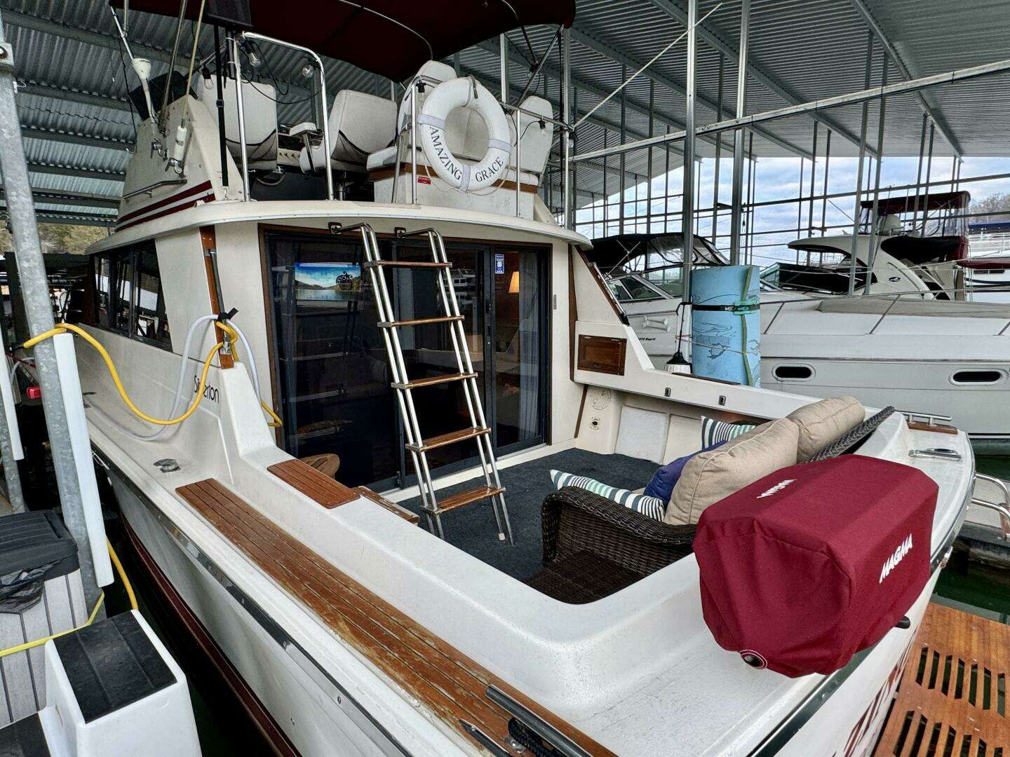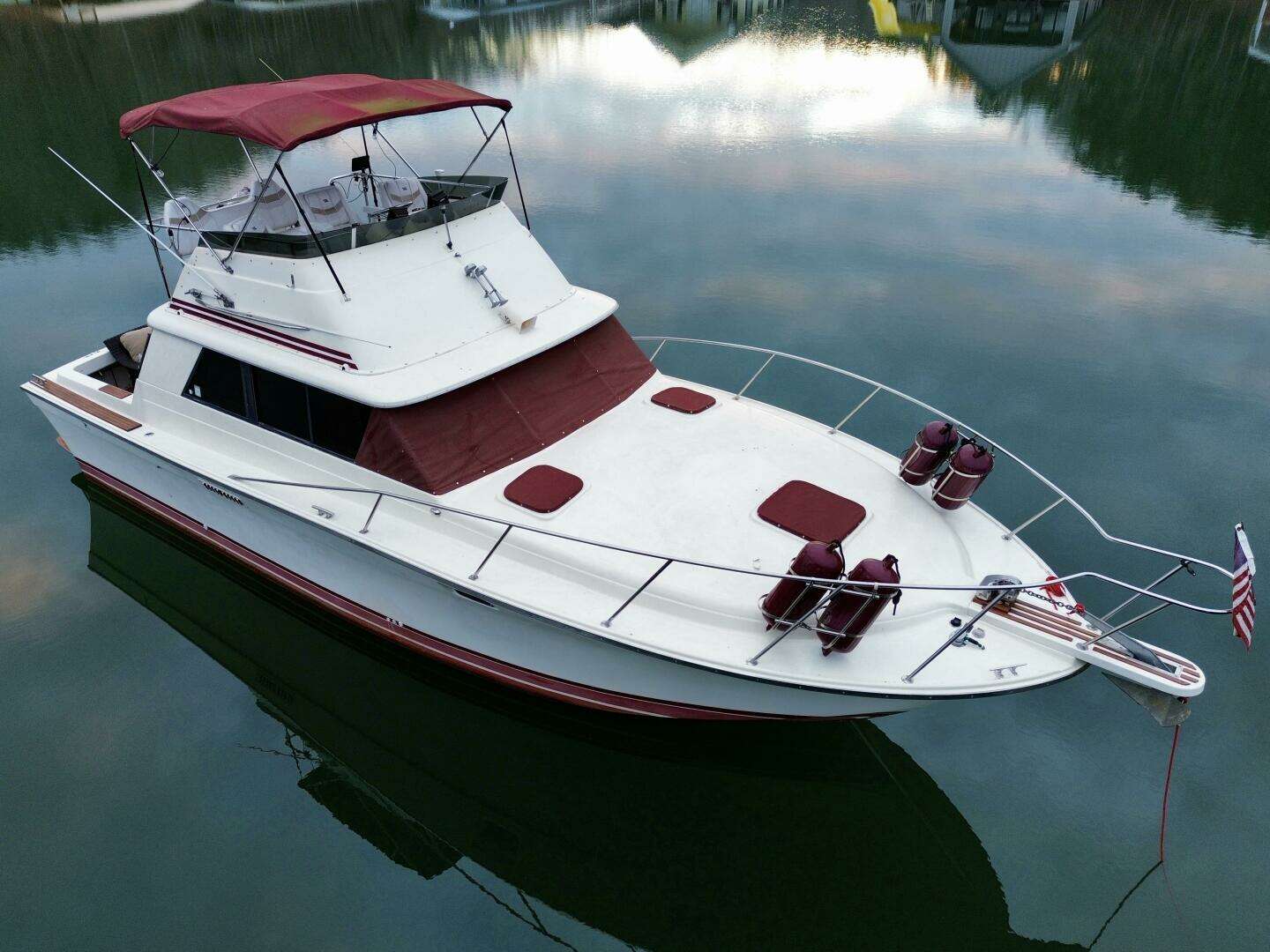 This Fresh Water 1979 Silverton 34 Convertible For Sale on Norris Lake Tennessee is equipped with twin Crusader 350ci V8 270HP inboard V-drive engines and features sleeping berths for 5-6 in a V-berth, convertible bunk/settee, and a Serta full-size convertible reclining sofa, plus an electric wet head with sink/shower, a galley with an AC/DC fridge, electric range, microwave, coffee maker, double stainless sink, and a magma gas grill mounted at the transom. Comfort is provided by a newer marine air conditioning unit with reverse cycle heat (16K/17K cooling/heating BTUs). Other notable features include upper and lower helm controls with a flybridge, a lewmar windlass anchor, hydraulic trim tabs, an AM/FM/CD stereo with cabin and flybridge speakers, VHF radio, hailer/intercom, onboard battery charger, halon fire suppression system, and more. The Norris Lake covered slip is transferable.