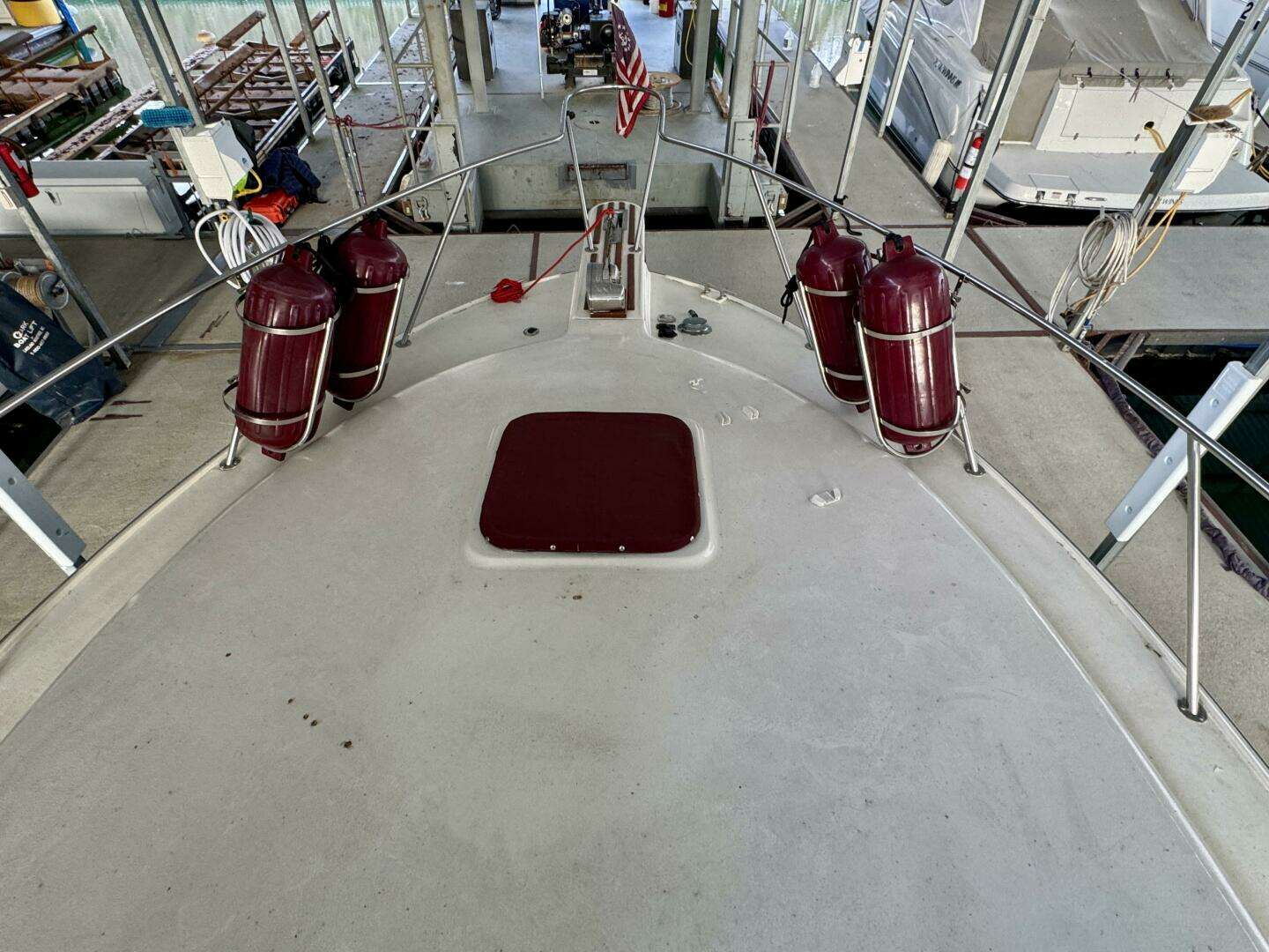 Looking towards the bow from the cockpit you've got a removable ladder for accessing the flybridge that's equipped with a bimini top, sitting and cupholders for 6, a hailer with an intercom to the cabin below, and more. You've got handrails integrated into the exterior sides of the flybridge for accessing the bow area where you'll find a lewmar windlass anchor, an integrated washdown in the anchor locker, and 4 fender holders with fenders.