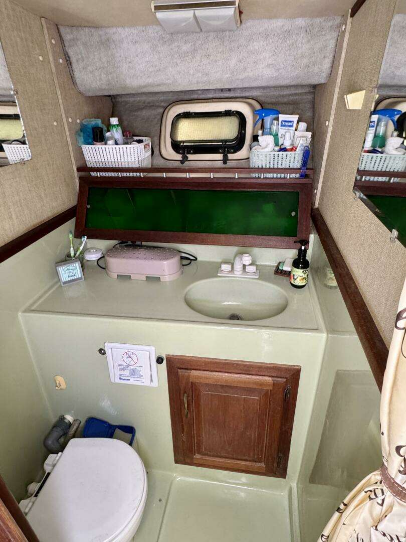 Directly to port is the wet head equipped with a raritan macerator head, a vanity sink/shower, vanity storage, two mirrors, a 12 volt light overhead and a port window.