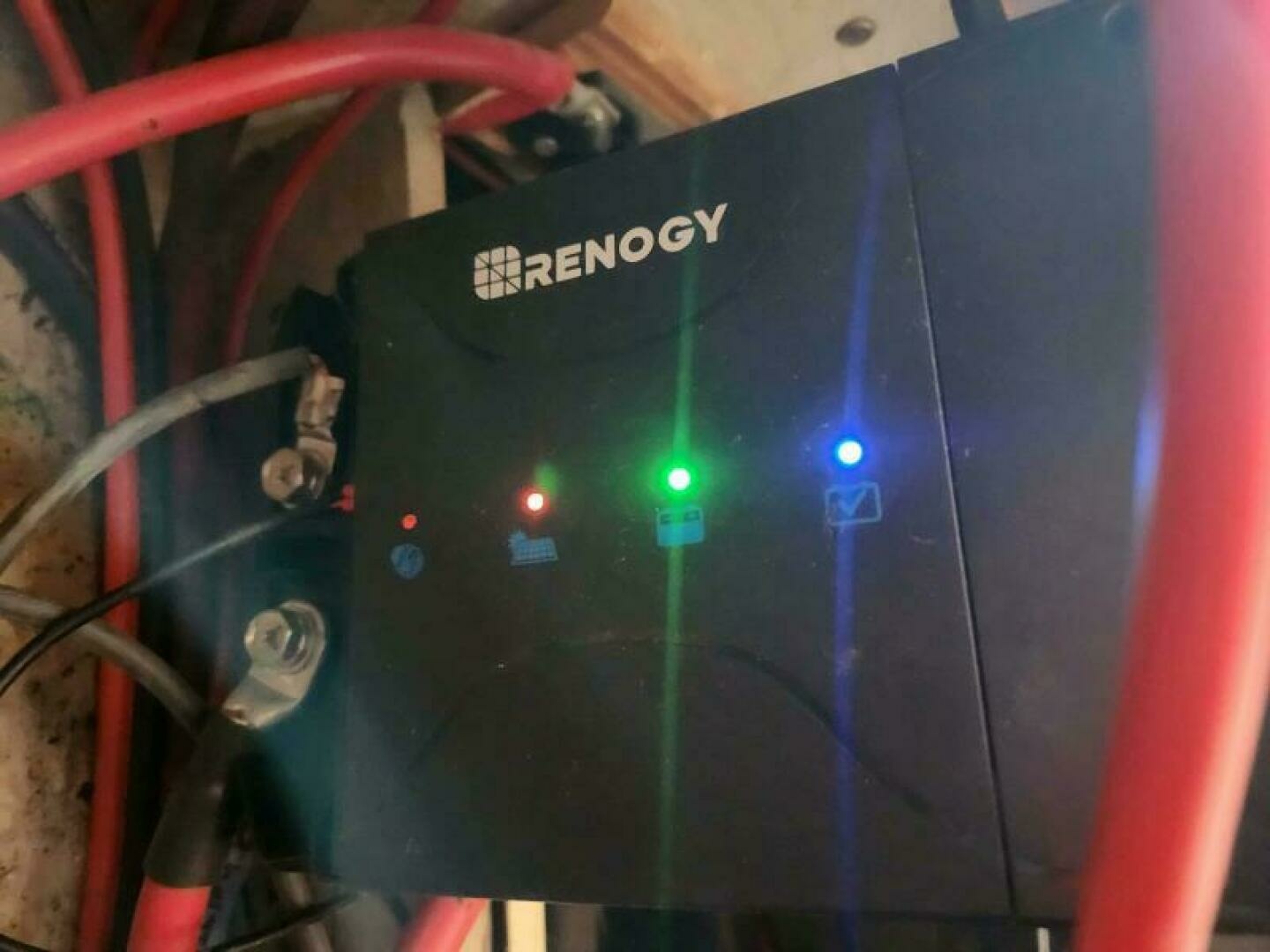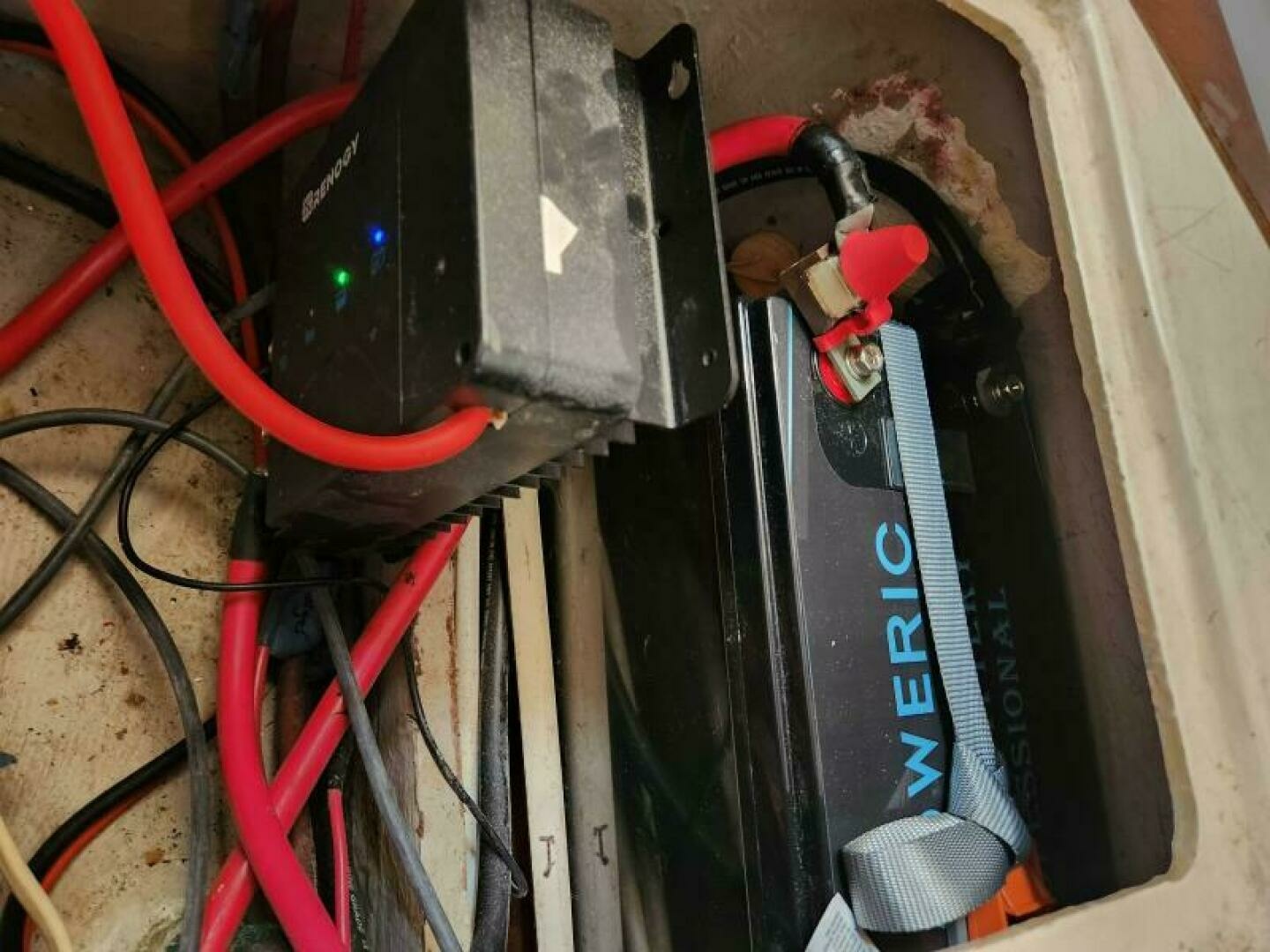 - 200W solar array and Renogy 30A battery charging system. [The boat draws 90Ah in 24 hours in normal sailing conditions and is fully charged by early afternoon most days.]