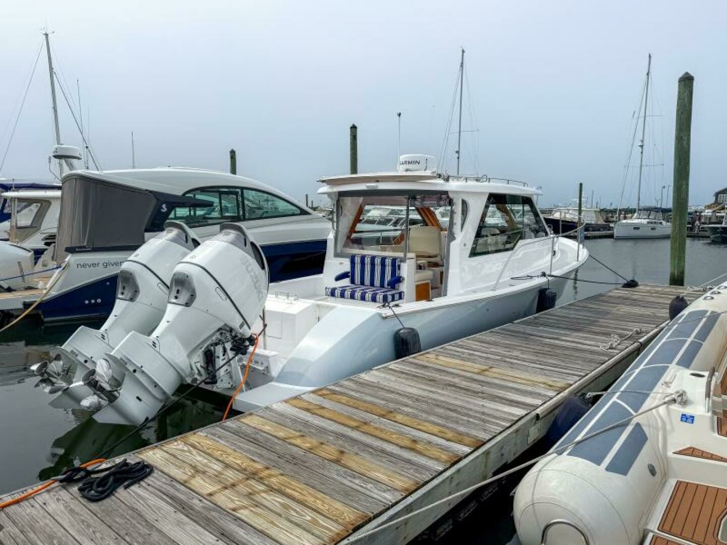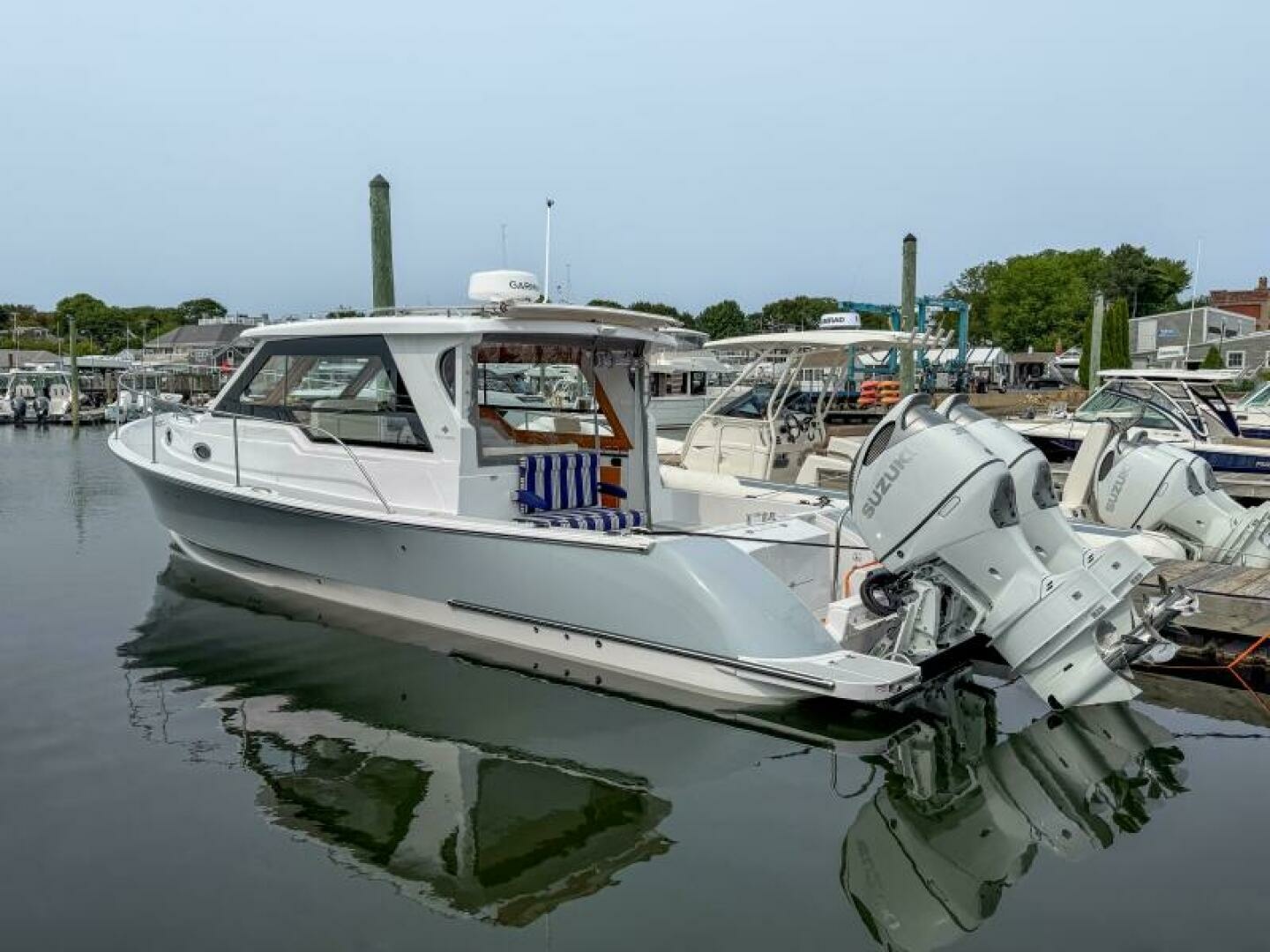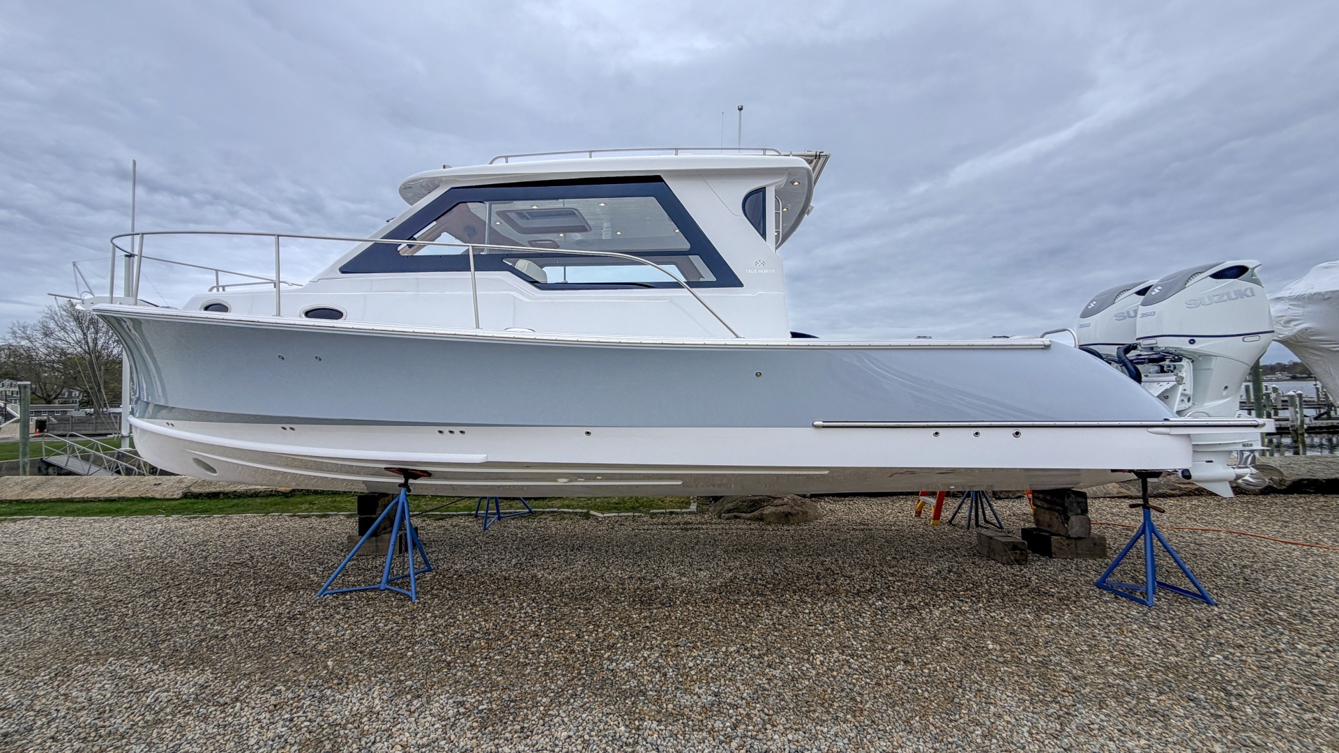 Powered by twin Suzuki 350 outboards with the Optimus joystick system, this True North 34 offers modern performance with stress‑free control: