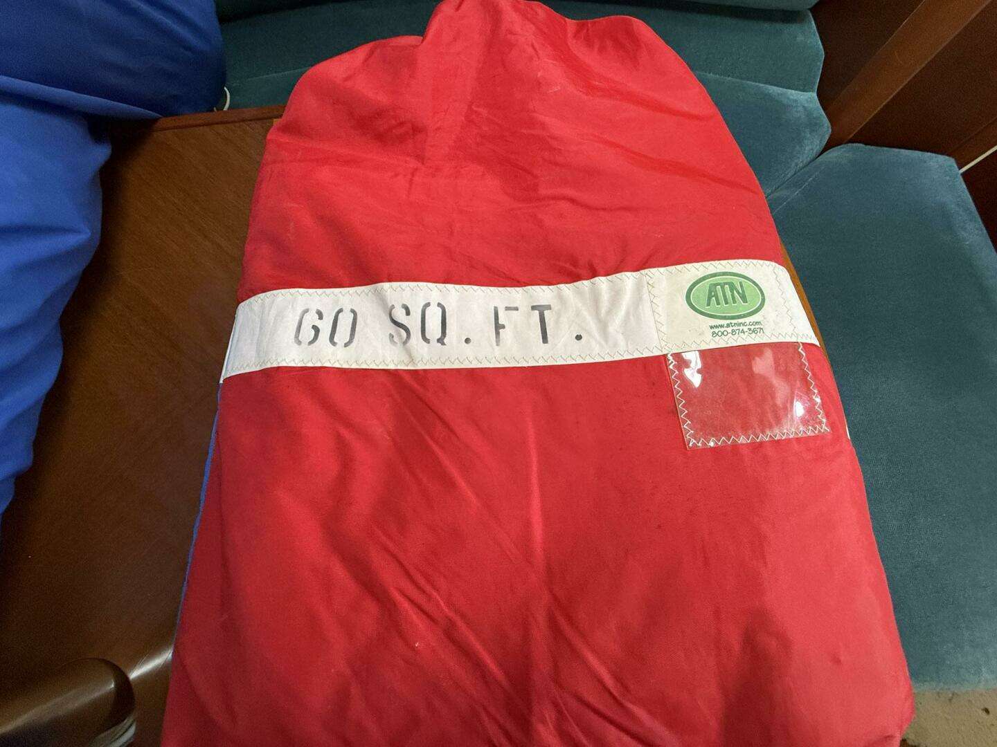The cockpit has large U-Shaped seating with teak seats for 4 plus skipper at the wheel, with removable cushions and storage underneath the seats. Under the port seat are the three house D27M batteries. The owner moved them there from under the quarter-berth for safety reasons. Under the starboard seat are a 6-person Plastimo raft that needs to be certified, life jackets, lightning protection cables and other safety gear. The transom seat can be lowered backwards onto the transom, creating a ladder to get in and out of the water. The vessel has an inline helm and wheel. For instruments there is a wind ST 60 + a Tri data auto - auto helm ST 4000. The Radar is a working Raymarine C70 (NOTE * works only in the cockpit, not at the nav station inside). The Garmin GPS map 545s works both inside and outside. The GPS has its own, independent depth meter, and it can connect to the Sirius satellite weather forecast through Garmin GXM31 when the next owner activates it ($50/month). Gauges at the helm include engine hour meter, fuel tank gauge and RPMs. You will also see a new Plastimo 135 compass. Directly in front of the helm is a storage bin that easily converts into the cockpit table. The cockpit is covered with a bimini and dodger with forward eisenglass, the wheel and helm also have a canvas cover. The propane bottle and smaller torch bottles are in the ventilated locker at the aft/port corner of the cockpit. You must open the big port locker to access the ventilated locker.