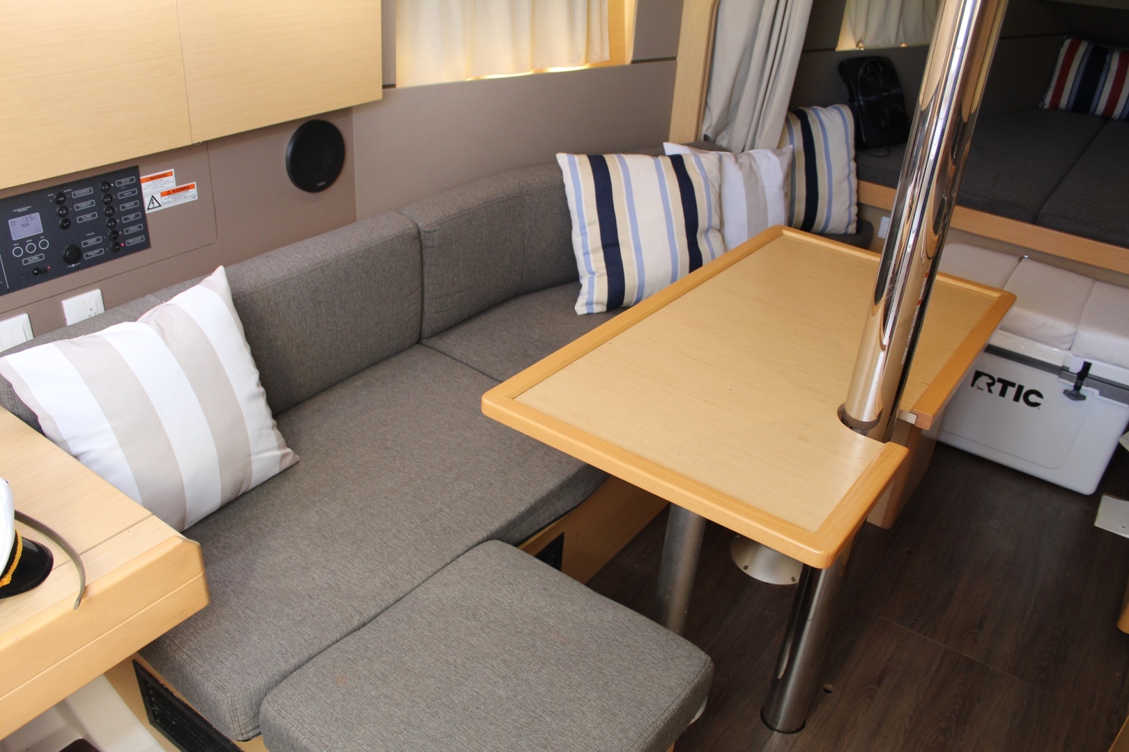 - Port settee seating in white marine leather w/ storage under bench seats