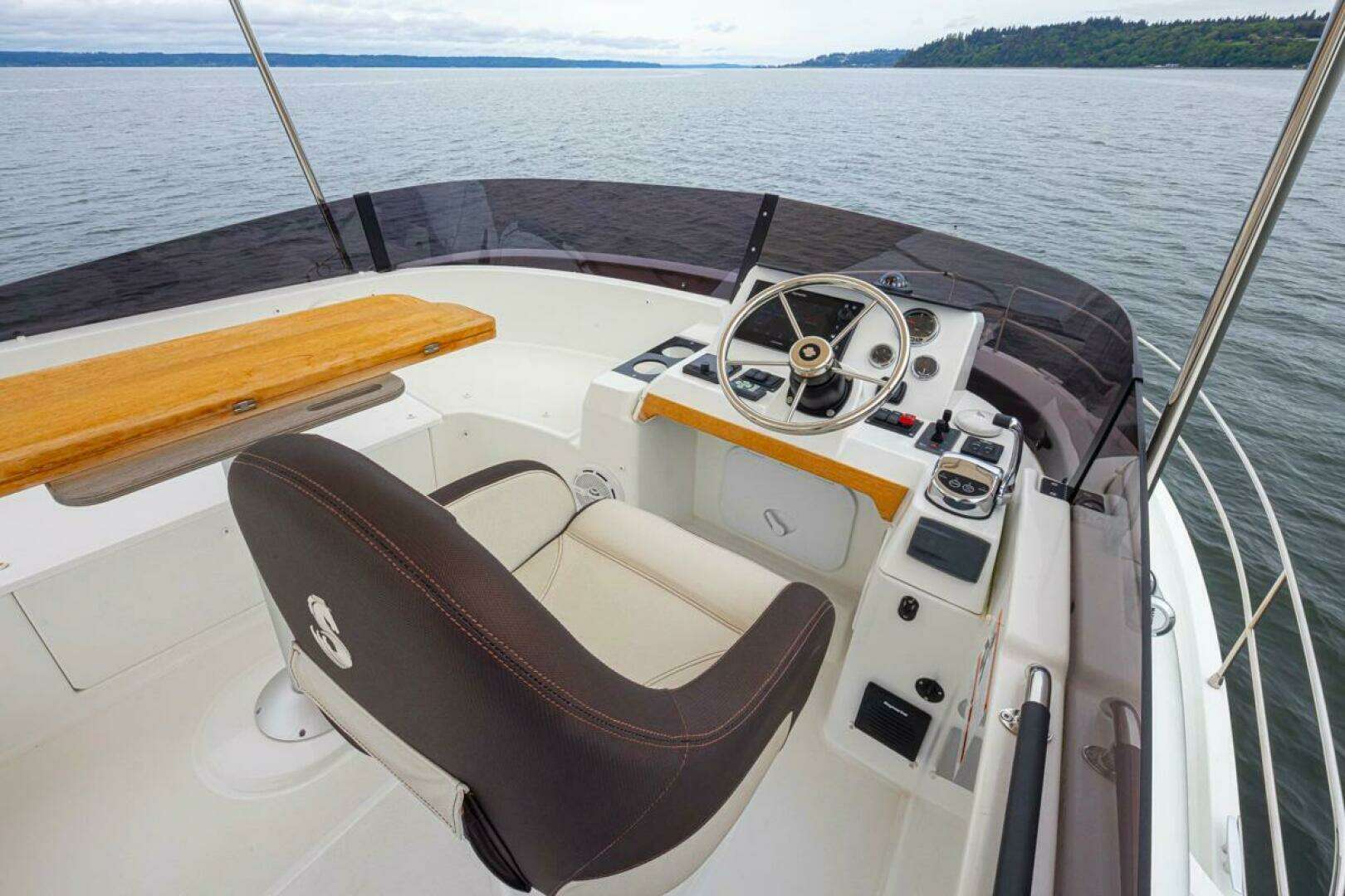 - Pilot console with control panel including Electric engine controls, Electric windlass control*, Thruster* and Trimtab
