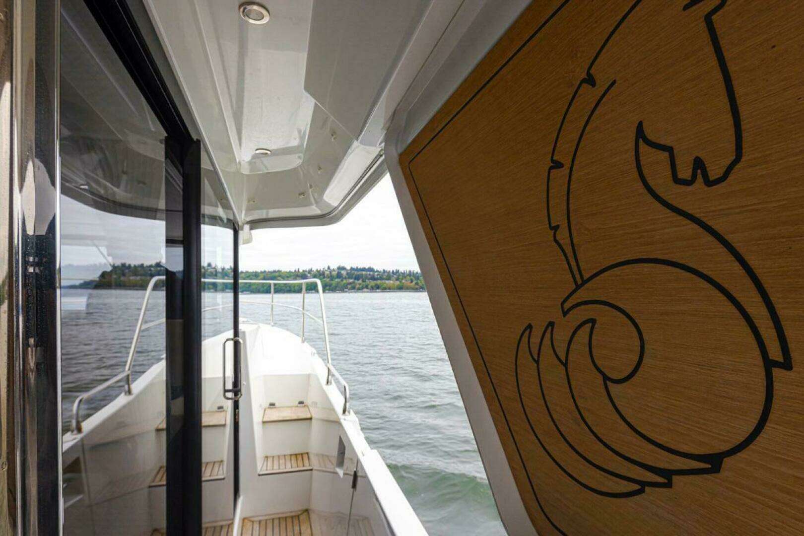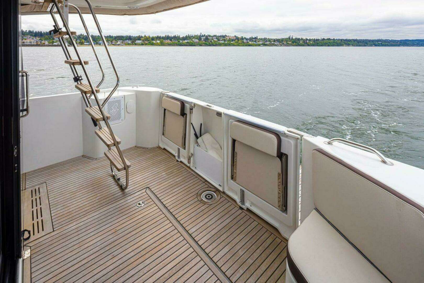 - Stainless steel access ladder to the flybridge with wooden steps and stainless steel handrails, vertical folding