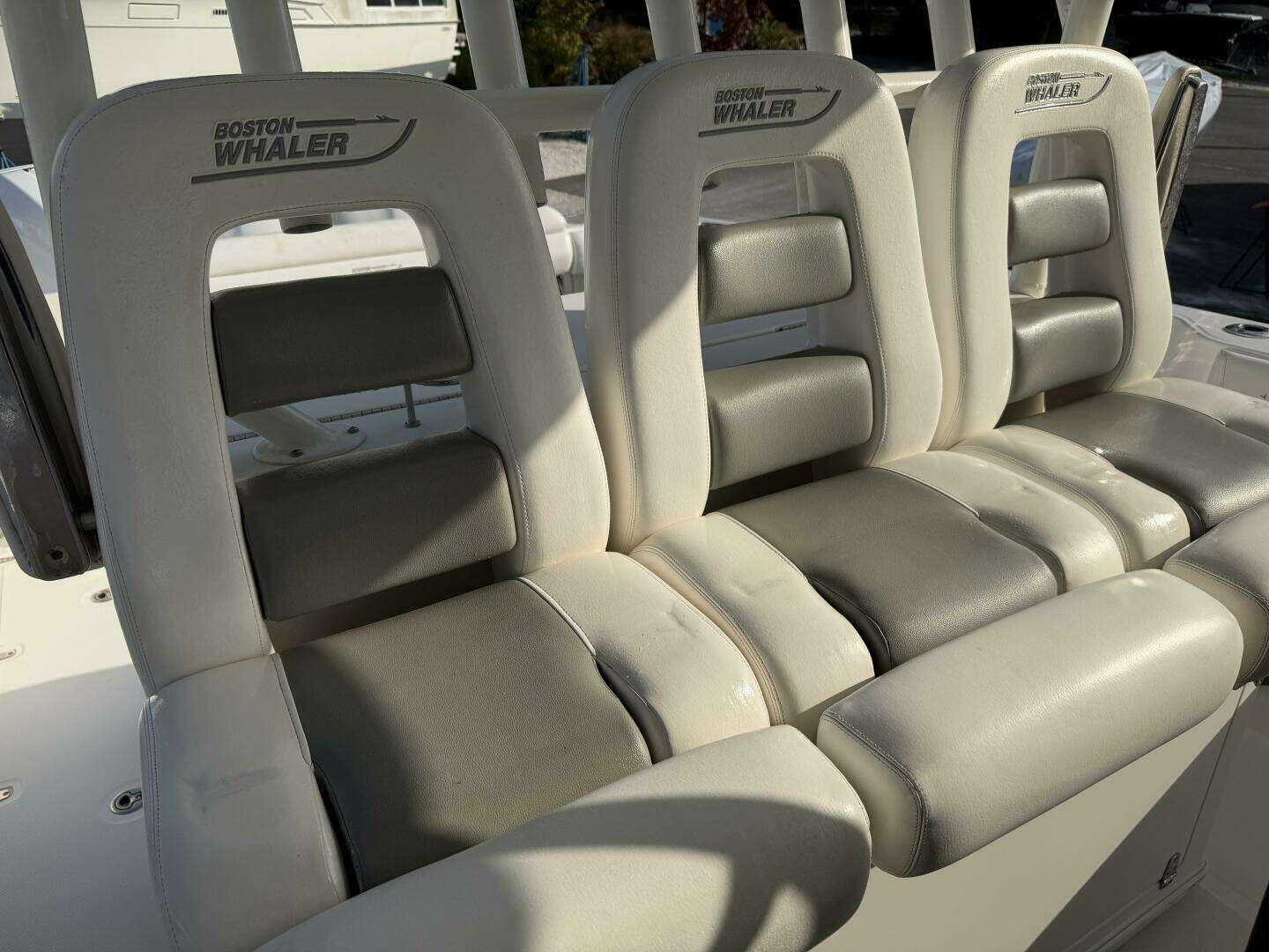 - Helm and companion bolster style seats (3) with fold-down armrests (2) (center seat is mechanically adjustable fore and aft)