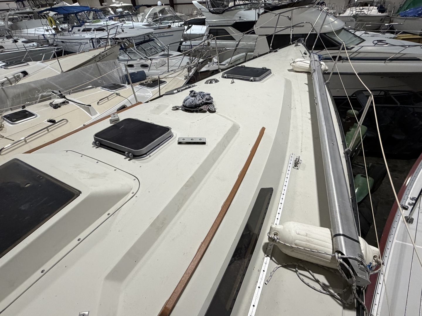 - Solid fiberglass hull/balsa cored deck