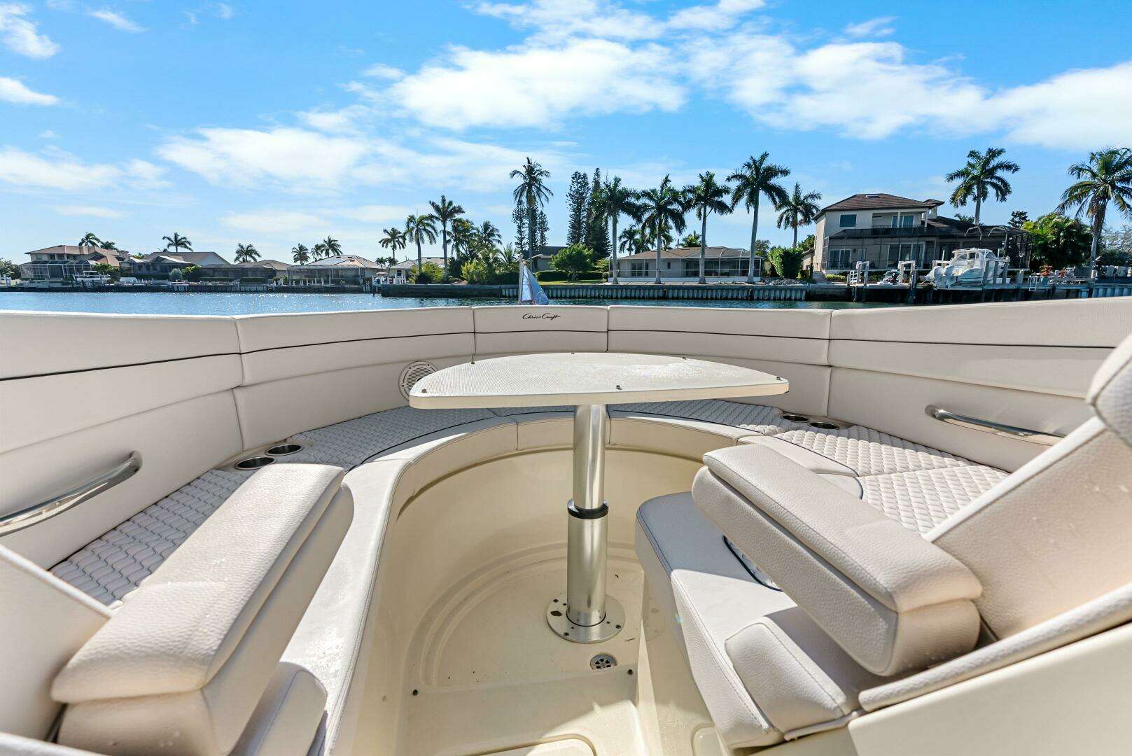 Step onboard and you’re surrounded by premium craftsmanship. Rich upholstery, stainless accents, and thoughtful design details remind you immediately why Chris-Craft sits in a class of its own. The spacious cockpit is built for entertaining, with generous seating, a well-appointed wet bar, and seamless flow throughout the boat. Forward seating is expansive and comfortable, while the aft sun lounge invites you to stretch out and relax.