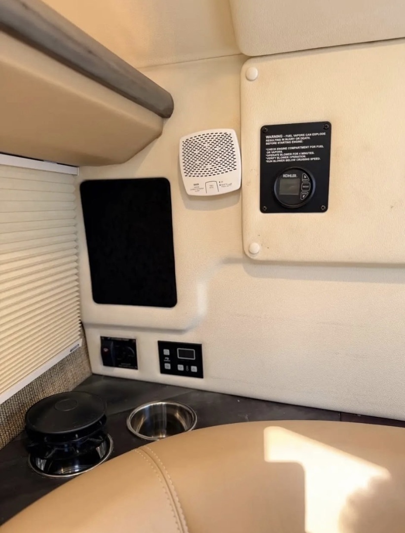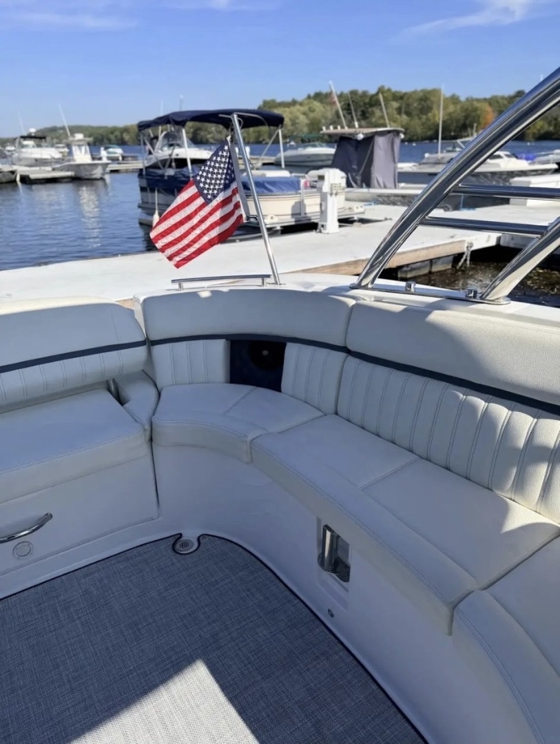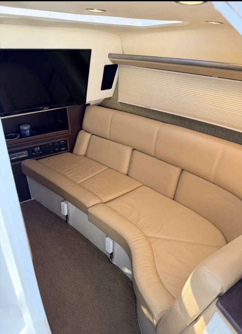 From the moment you step aboard, you’ll notice the premium fit and finish—hand-stitched upholstery, rich textures, and a thoughtful layout designed for both entertaining and relaxing. The expansive cockpit offers generous seating with convertible sun loungers, a well-appointed helm with intuitive controls, and a premium sound system that sets the tone for every outing.