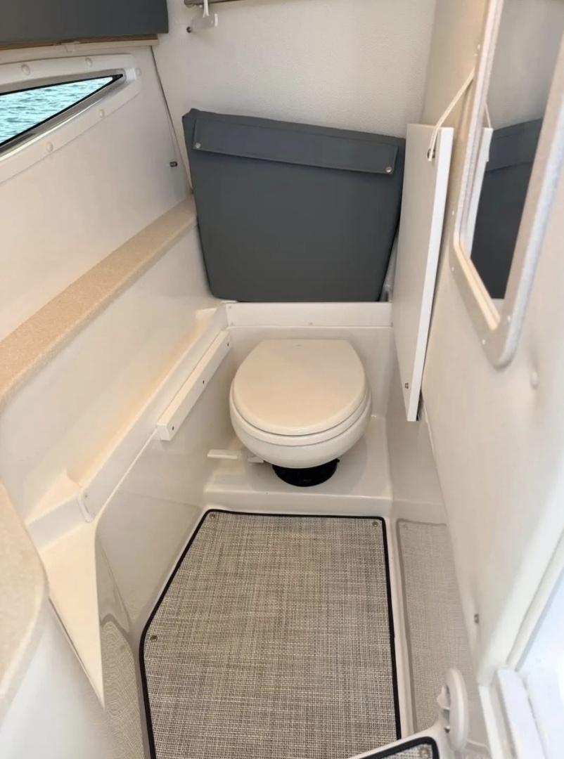 Below deck, you’ll find a comfortable cabin space ideal for escaping the sun or accommodating overnight stays, complete with a head and refined finishes that elevate the experience beyond your typical day boat.