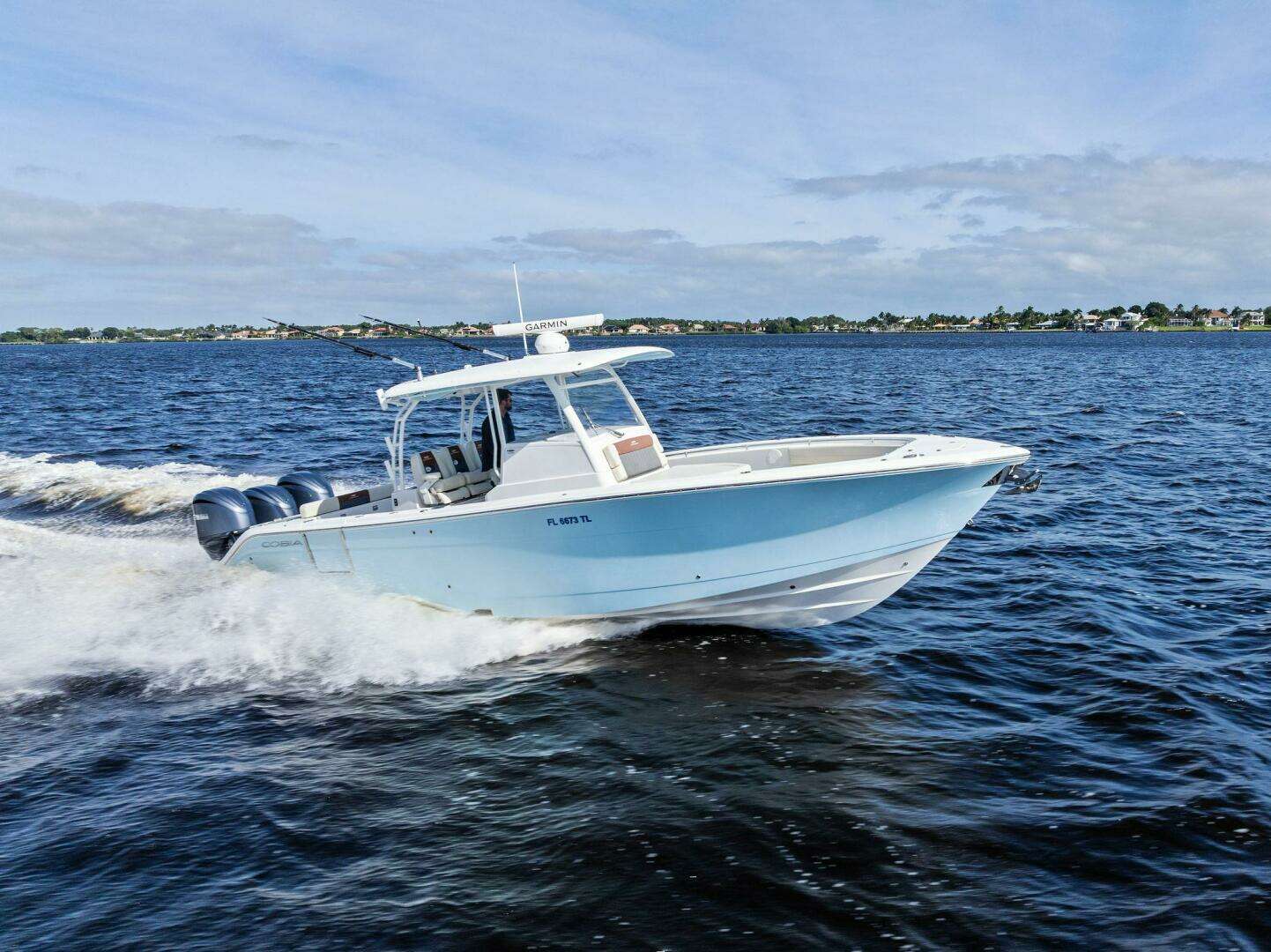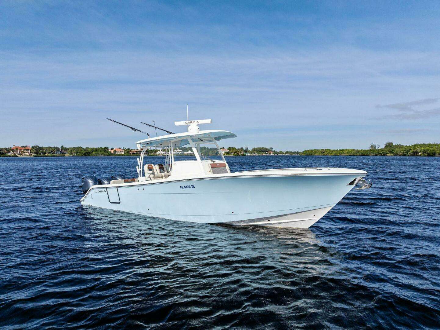 The Cobia 350 CC is a high-performance, luxury-oriented center console boat that blends serious fishing capability with refined comfort. At roughly 34.33 feet in length (with a beam of 11.17 ft), it provides substantial real estate for both angling and leisure. The hull is constructed using vacuum-infused fiberglass and features a double-stepped design, which helps optimize speed, efficiency, and a smooth ride with the SeaKeeper SK2.