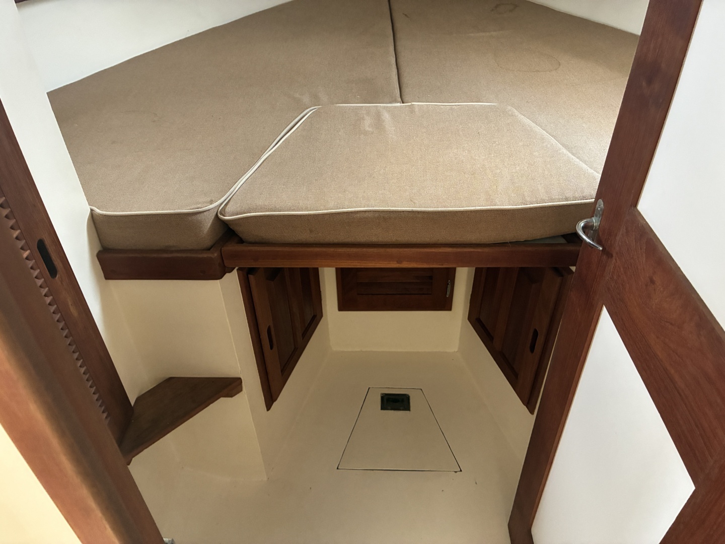 Descending the companionway, the galley is located to port, well-equipped for extended cruising, with the head situated to starboard. Forward, the vessel features a generously sized V-berth, providing comfortable accommodations for overnight stays.