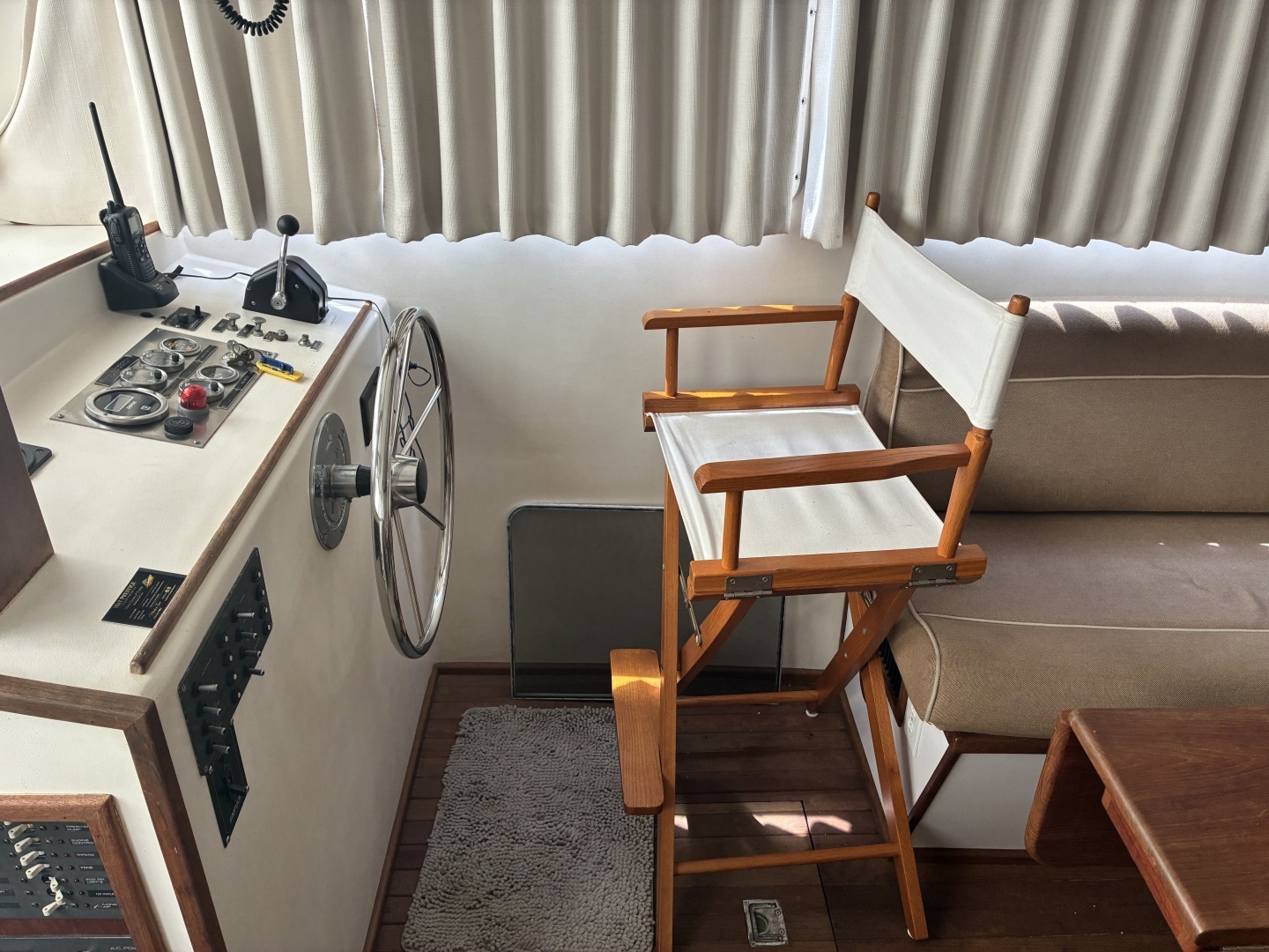 The helm station is positioned to starboard, offering excellent visibility and easy access to controls, while a bar area is conveniently located opposite, making the space ideal for entertaining.
