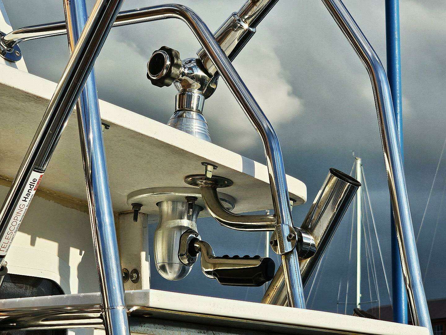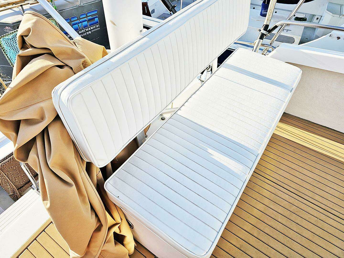 Now, up the ladder to the flybridge. This is a nicely designed ladder with very wide, deep steps with a good handrail that angles forward at the top making for good flybridge access and great all round visibility. Once up there the bridge decking is newly installed fake teak providing a great footing and nice custom look. Seating is provided with two "Todd 1500" helm chairs and a bench seat with back rest and storage inside. For sun protection there there is a collapsible bimini with boot when not in use. For all antenna's there is a radar tower located behind the bench seat and 6 more rail mounted rod holders.