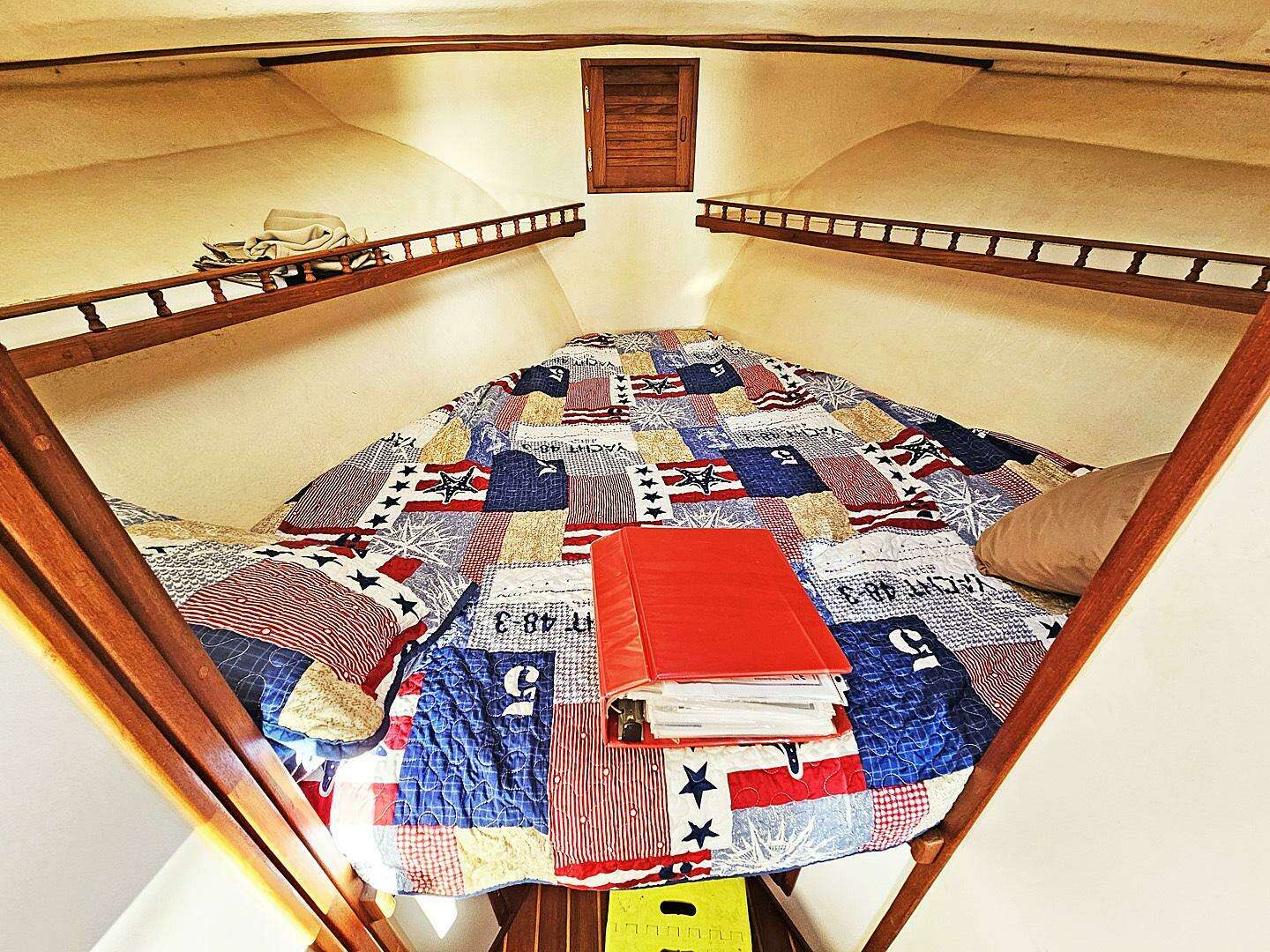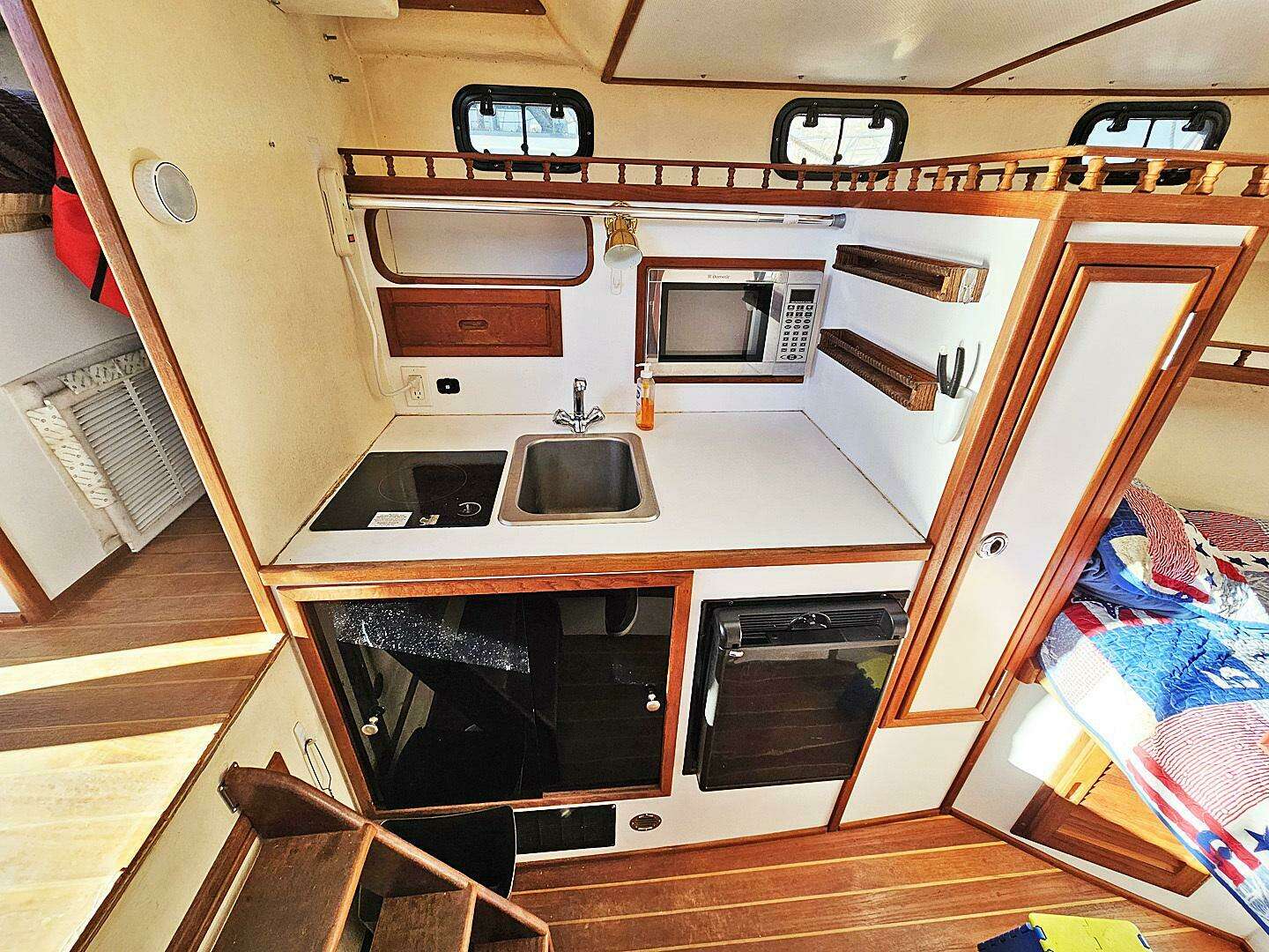 Moving forward and down 3 short steps to port is a compact galley. Within this space you will find a second refrigerator and storage beneath the counter, and on the counter there is a large single bowl stainless steel sink and a single burner glass top stove. Above the counter is more storage and a built in microwave oven. Just forward of this is a tall hanging locker that divides the galley from the V-berth on the port side.
