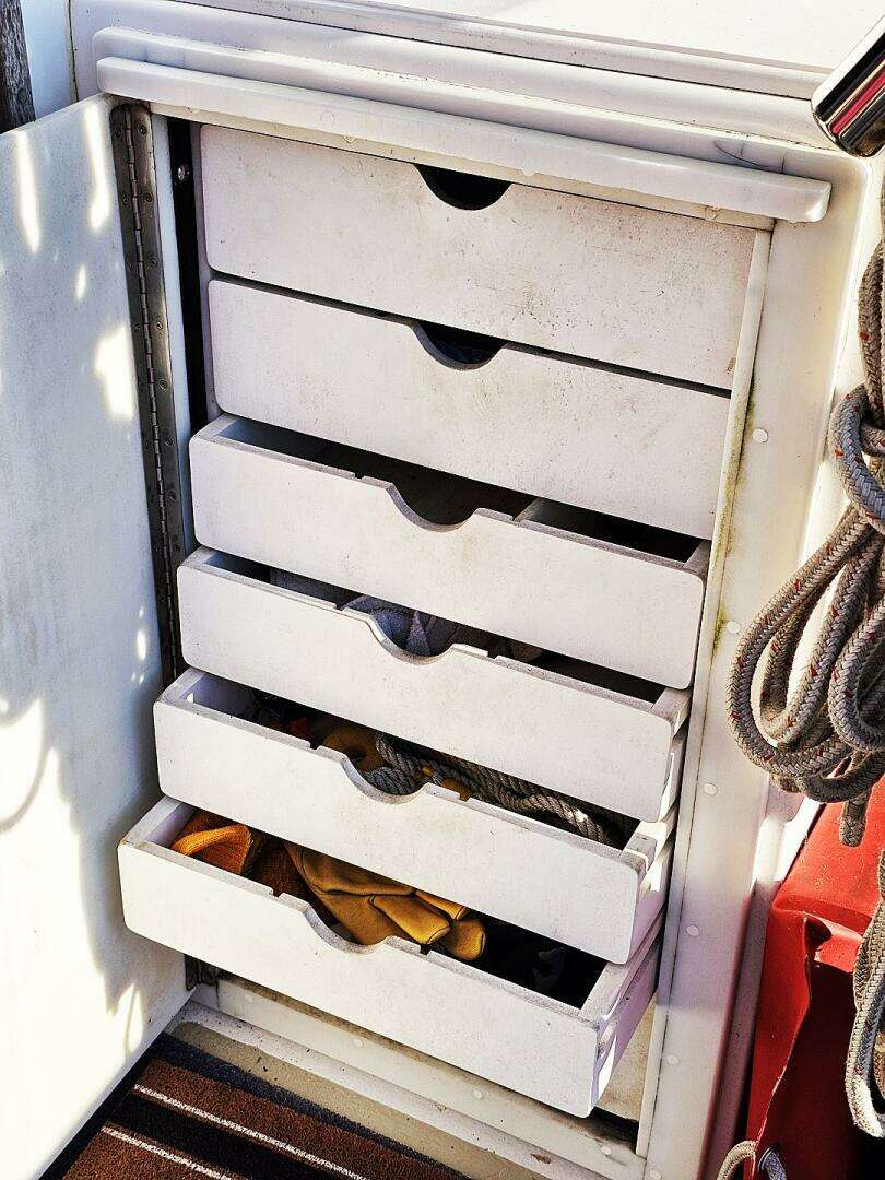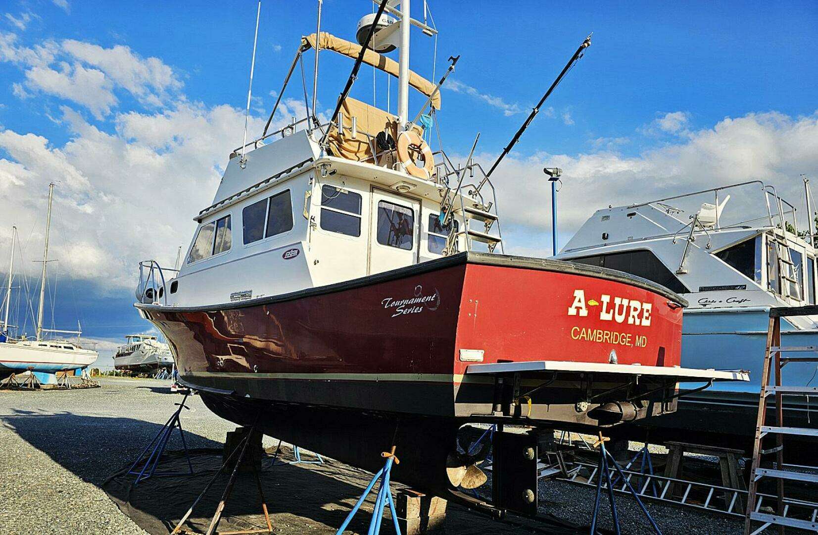A-LURE is a great example of a very rare Eastern Casco Bay 35. With her beautiful burgundy "Awlgriped" hull and flybridge make here stand out in the crowd. She has a modified deep-V hull and single engine lobster boat design making her a nice performing, fuel efficient yacht. Her current owners have both fished a lot and just completed the "Great Loop" so her air draft is low enough for that trip. Her cockpit is quit large with built in 7 draw tackle box beneath the flybridge ladder, fish box under the sole with pumpout, livewell built into the transom and a small door providing indoor rod storage. When fishing there are 8 gunnel mounted rod holders, 10 ladder mounted and outriggers.
