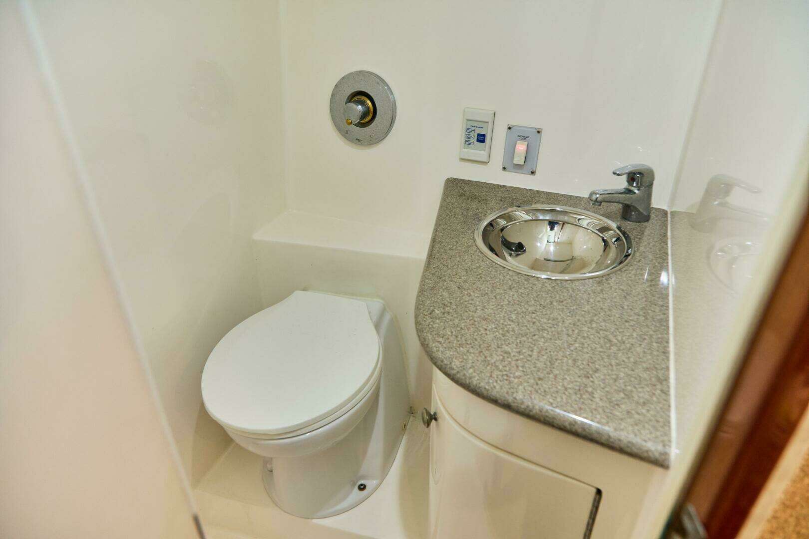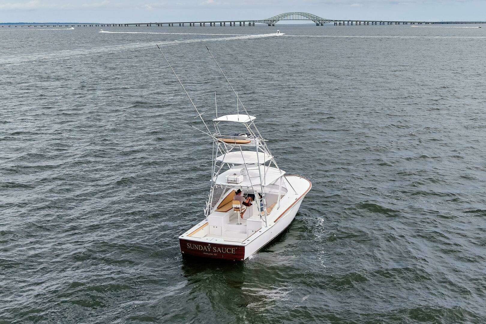 Turnkey sportfisher with twin CAT 3126B 450 HP engines, tuna tower, Garmin electronics, Simrad autopilot, and full deck/fishing upgrades. Spacious salon with U-shaped lounge, teak dinette, AC, enclosed head, galley, and comfort features. Ready for offshore adventures.