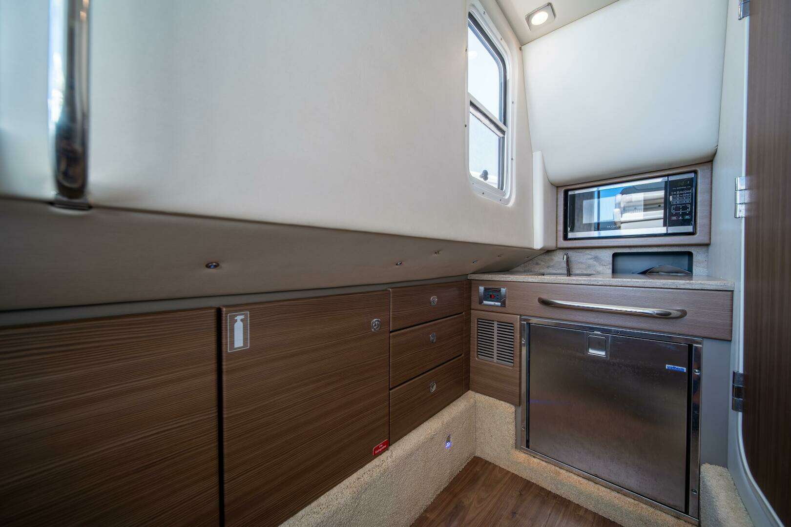 - Compact galley equipped with sink, Isotherm refrigerator/ice maker, microwave, and ample storage for overnight essentials