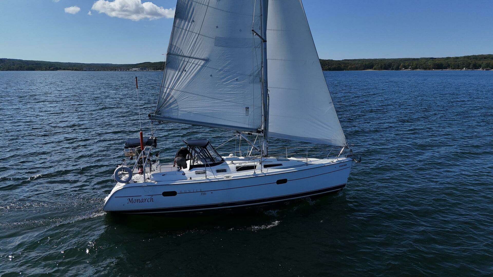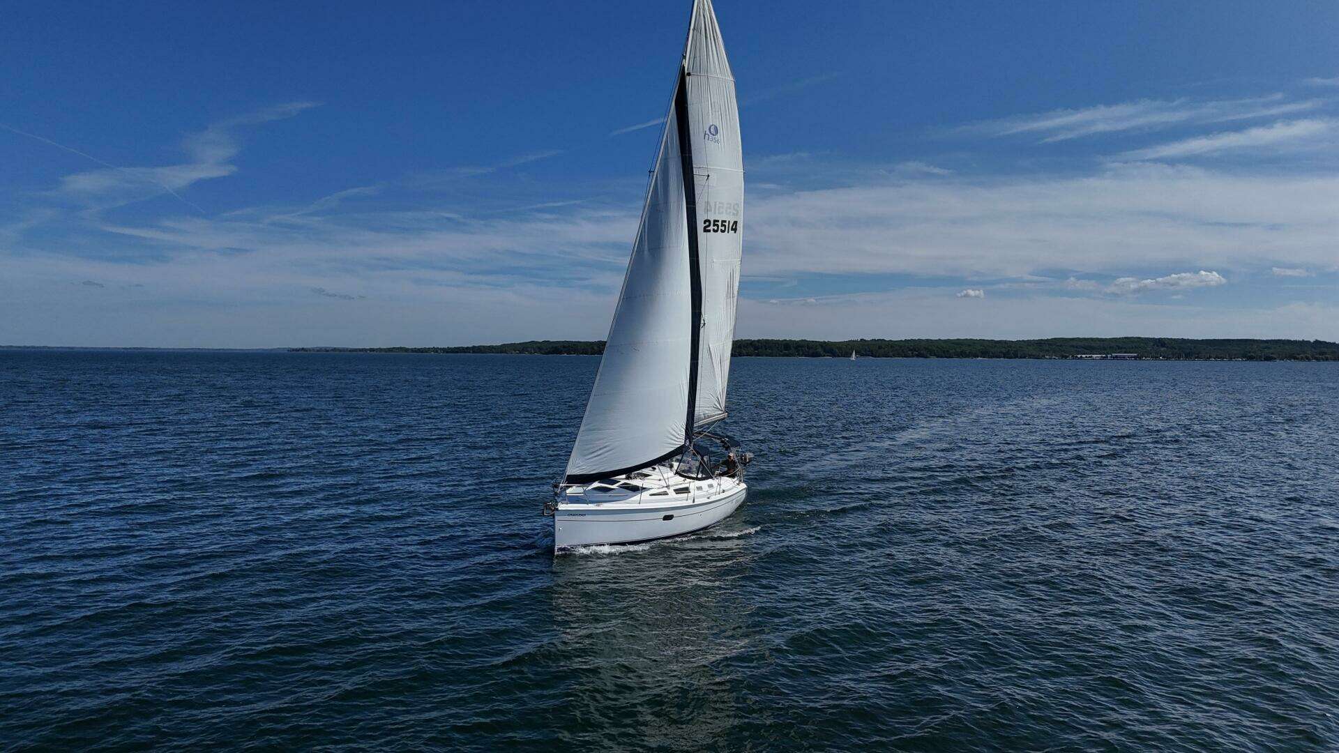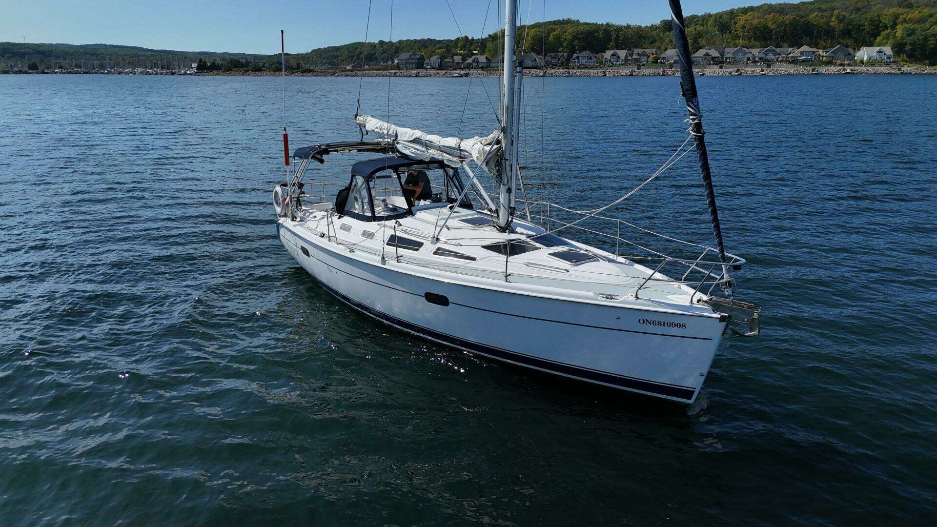 NEW FULL ENCLOSURE, COCKPIT CUSHIONS, LARGE AFT CABIN, GARMIN CHART PLOTTER, 2019 DINGY, SHOAL DRAFT, READY TO CRUISE. This 2003 Hunter 356 is a 35′6″ cruising sailboat with a 12′ beam and 5' draft. It also features Hunters proven fractional “B&R” style rig for easier sail handling. Below deck you’ll find comfortable accommodations for family or guests: with two private cabins, a convertible salon berth, full galley, and decent tankage for extended weekends or cruising. On deck, the layout emphasizes ease: all control lines led aft, a spacious cockpit, and a walk‑through transom with swim platform make it a friendly boat for cruising, sailing, and just relaxing at anchor or at the dock. In short: The Hunter 356 offers a strong blend of comfort, ease of handling, and cruising capability.