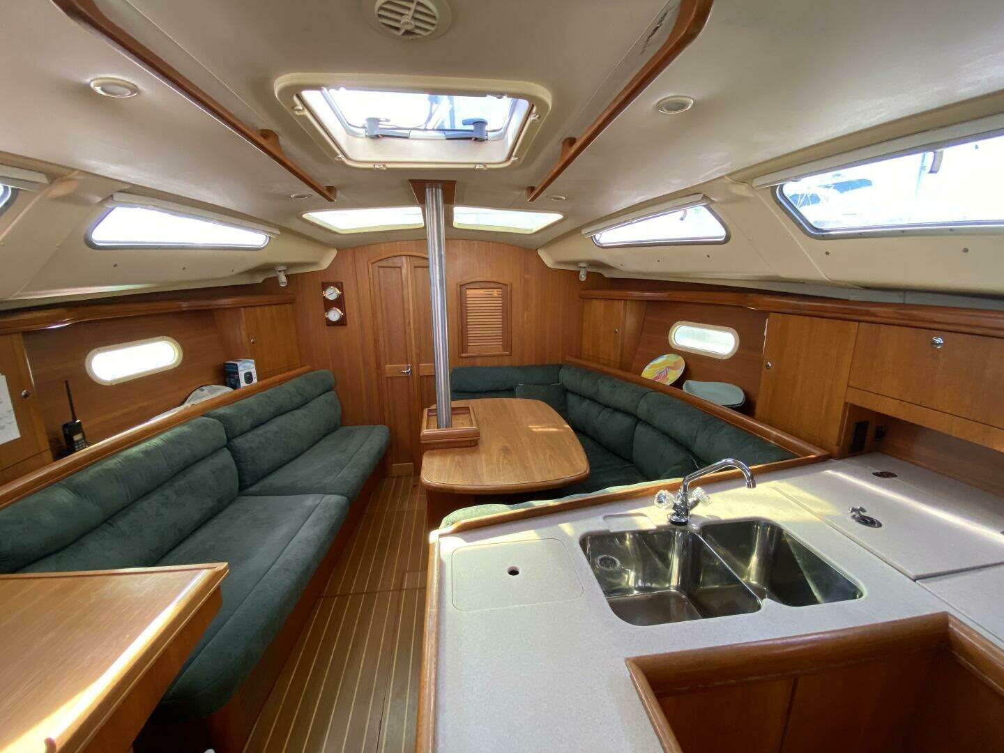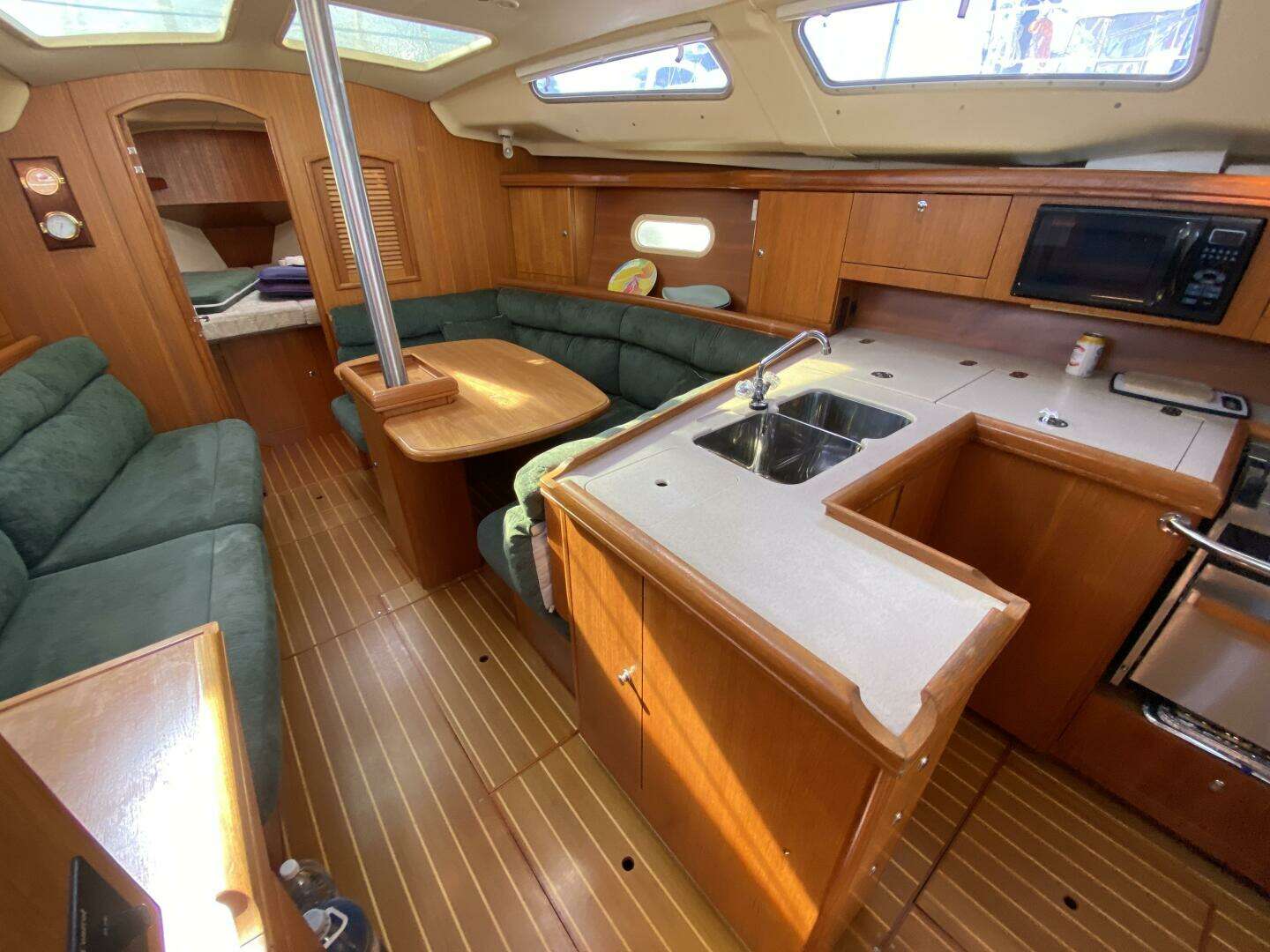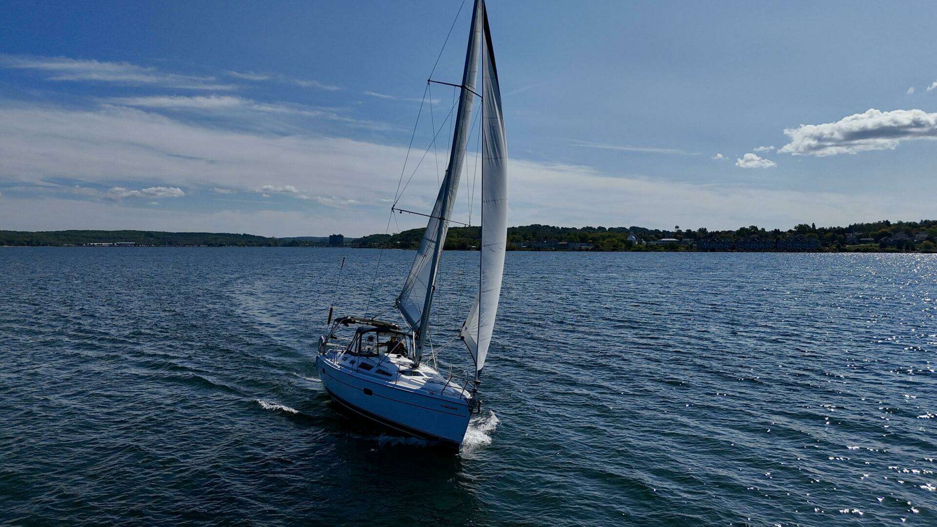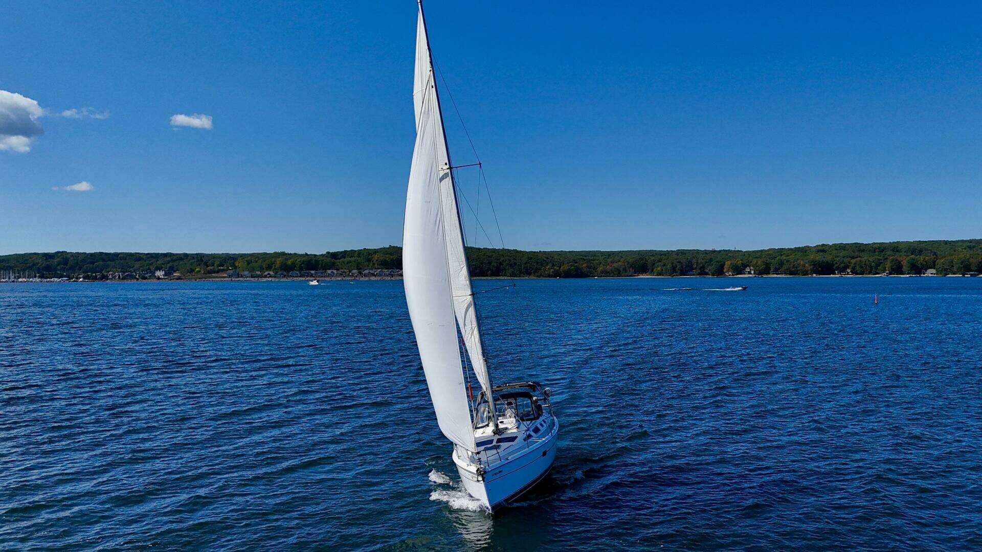 NEW FULL ENCLOSURE, COCKPIT CUSHIONS, LARGE AFT CABIN, GARMIN CHART PLOTTER, 2019 DINGY, SHOAL DRAFT, READY TO CRUISE. This 2003 Hunter 356 is a 35′6″ cruising sailboat with a 12′ beam and 5' draft. It also features Hunters proven fractional “B&R” style rig for easier sail handling. Below deck you’ll find comfortable accommodations for family or guests: with two private cabins, a convertible salon berth, full galley, and decent tankage for extended weekends or cruising. On deck, the layout emphasizes ease: all control lines led aft, a spacious cockpit, and a walk‑through transom with swim platform make it a friendly boat for cruising, sailing, and just relaxing at anchor or at the dock. In short: The Hunter 356 offers a strong blend of comfort, ease of handling, and cruising capability.
