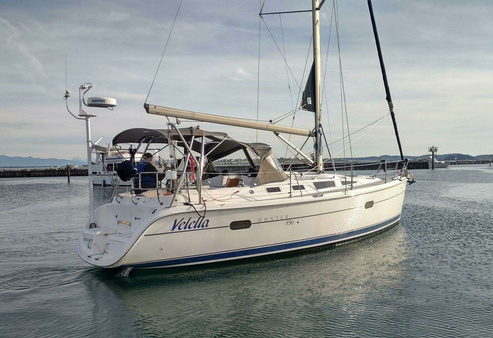The Hunter 356 is a fine balance of practical design features that will appeal to a wide range of boaters. Over 500 of this model were built as a testament to the designs appeal. The hull is easily driven under power or sail and features an easily managed roller main and jib, a large covered cockpit with ample seating and storage, a convenient walk thru transom, a functional galley, a plush salon, a vee berth forward and a queen size berth aft. For a 35' boat the Hunter 356 Velella has a lot to offer. This beauty has been well cared for by her experienced owner of the past 11 years. Special features include;