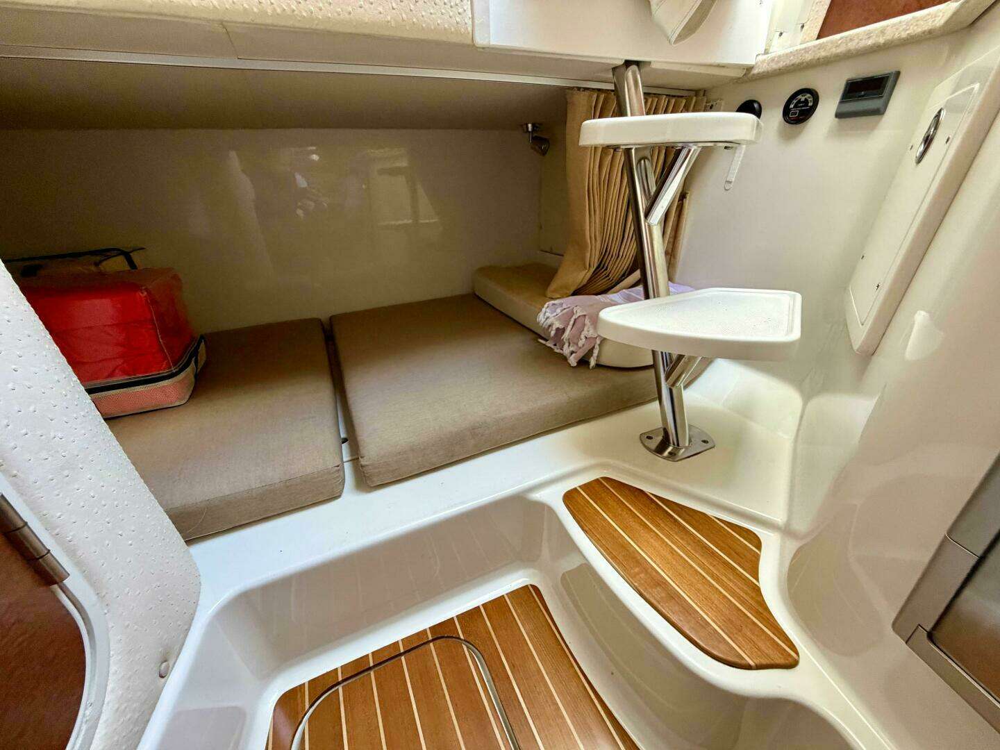 Air-conditioned express cabin with convertible forward dinette/ v-berth, mid-cabin berth, and stand-up head with shower. Compact galley/ wet-bar with refrigerator, sink, microwave, and ample storage. The VX interior delivers true weekender comfort on a fish-first platform. Fit-and-finish is upscale for her class, with practical storage and easy-clean surfaces.