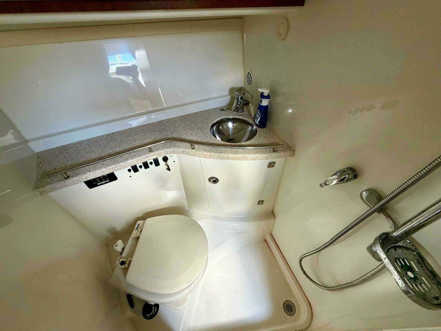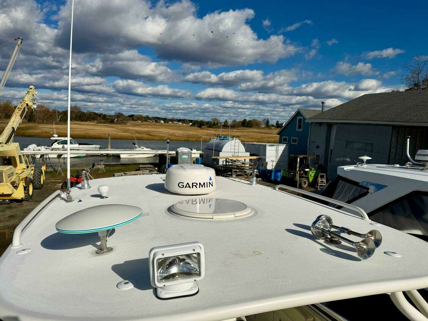 - ICOM flush-mounted VHF with a 6’ Shakespeare antenna on hardtop