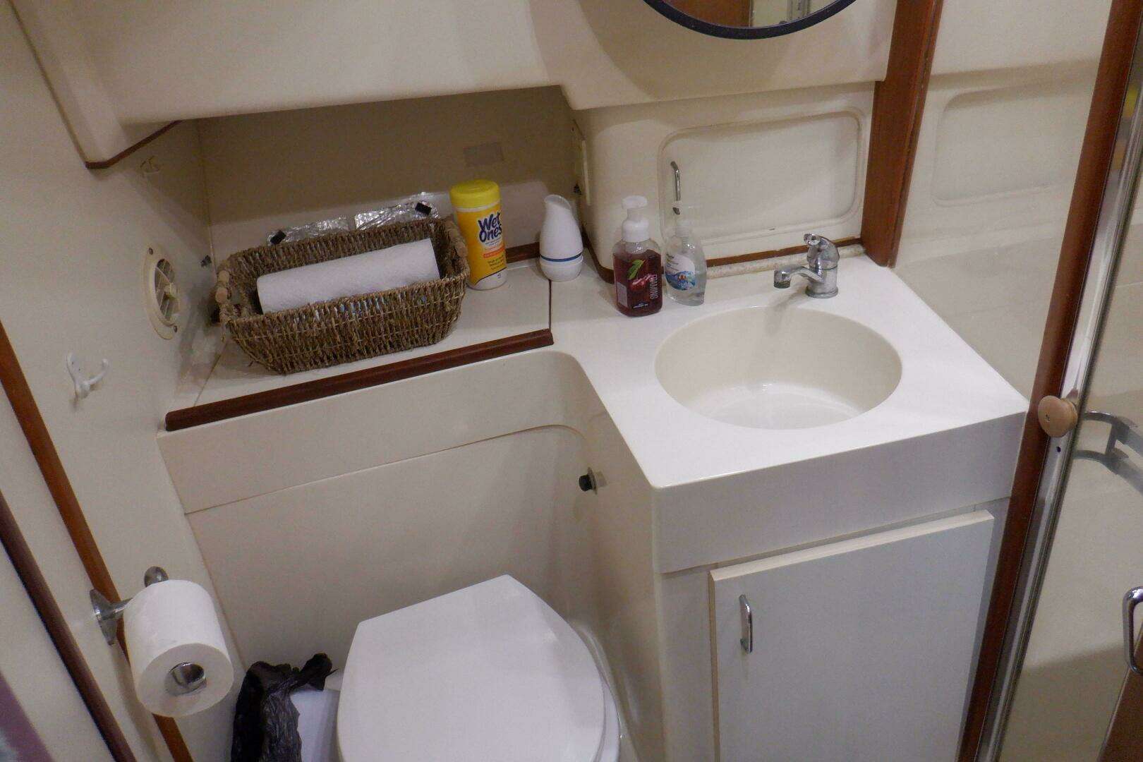 Designed for Great Loop cruising, coastal passages, or comfortable liveaboard life, this 350 features dual-zone reverse-cycle air conditioning (16k & 12k BTU), a spacious salon with cherry interior, a fully equipped galley with Corian counters, and a private master stateroom with island berth. The guest cabin with twin berths and a separate enclosed shower make her ideal for cruising couples or small families.