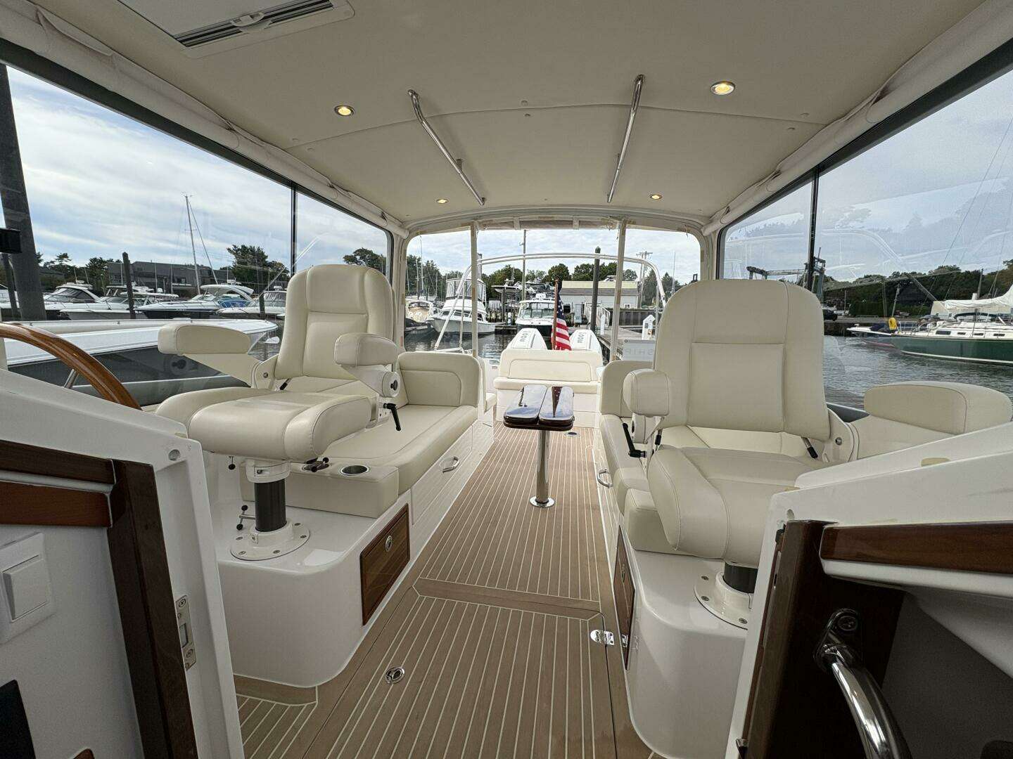 The all-weather pilothouse offers 360° visibility and seamless indoor/outdoor living, keeping you comfortable in every season. Unwind below in classic nautical styling that features a full-size wet head with shower, full galley to port, and a roomy V-berth. Climate control via two-zone air conditioning (pilothouse and cabin).