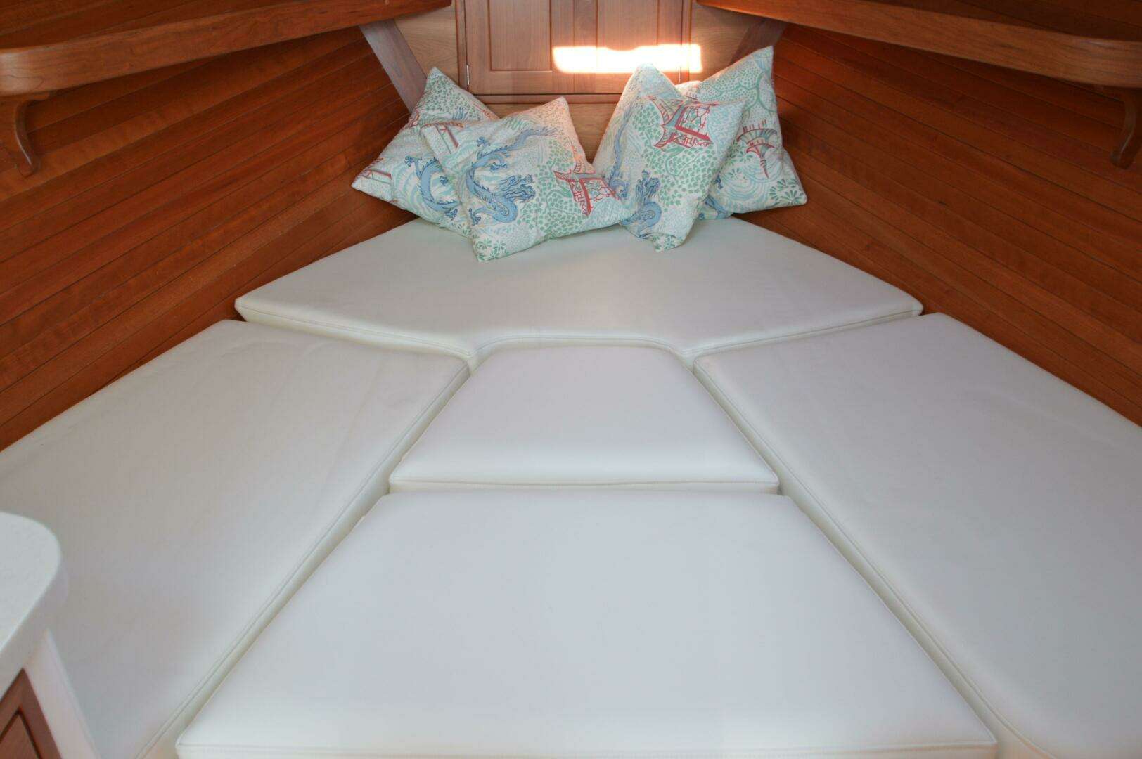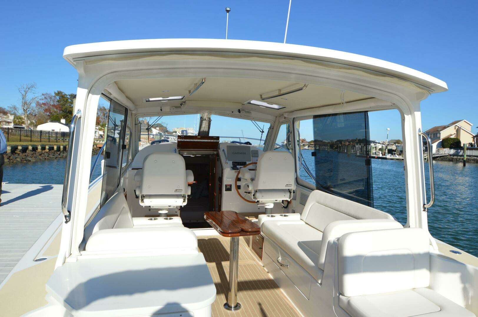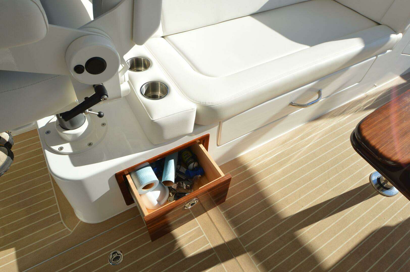 The MJM 35z has an incredible layout for entertaining with a single-level helm deck and cockpit area with plenty of seating. And she is a performer at nearly 50mph at wide open throttle. She has a shallow draft due to her outboards, which also offer an abundance of storage where an inboard boat would house the motors. Her interior is exquisite with a beautiful clear Awlgrip-finished teak and holly sole as well as satin-finished Cherry wood throughout the rest of the cabin. She has a large V-berth forward with filler cushions, a functional galley, enclosed head with shower, and an abundance of storage through the yacht. She is the perfect boat for entertaining, enjoying the boat with family, weekending, pulling up to a sandbar, or even extended cruising. Extremely versatile boat.
