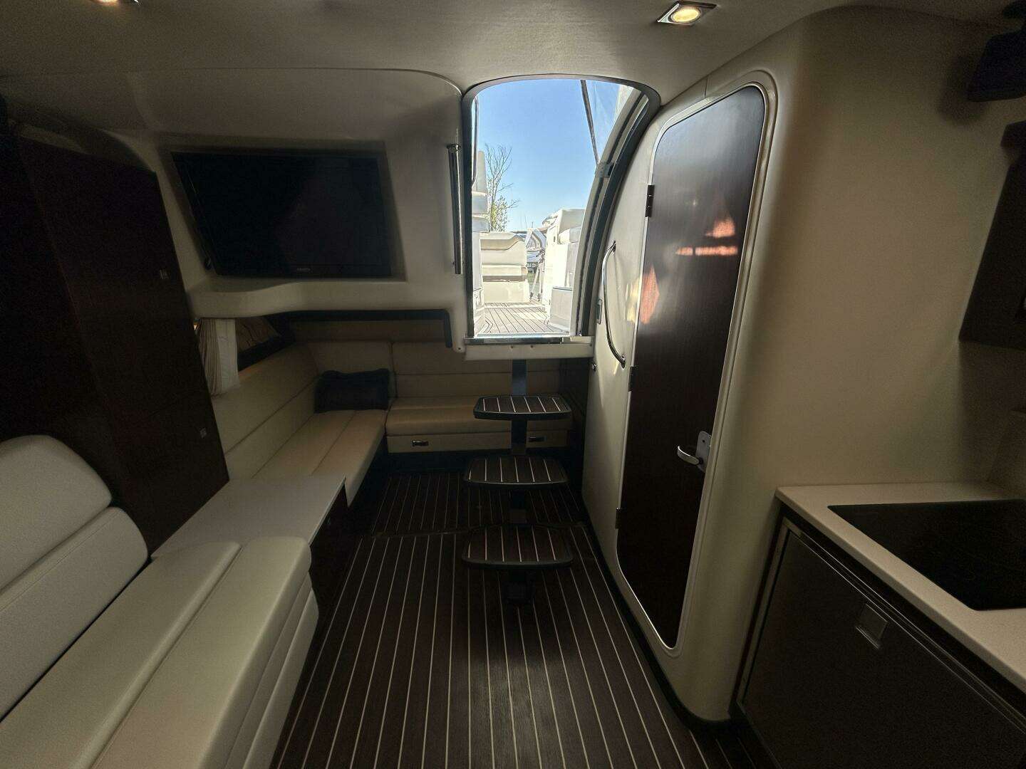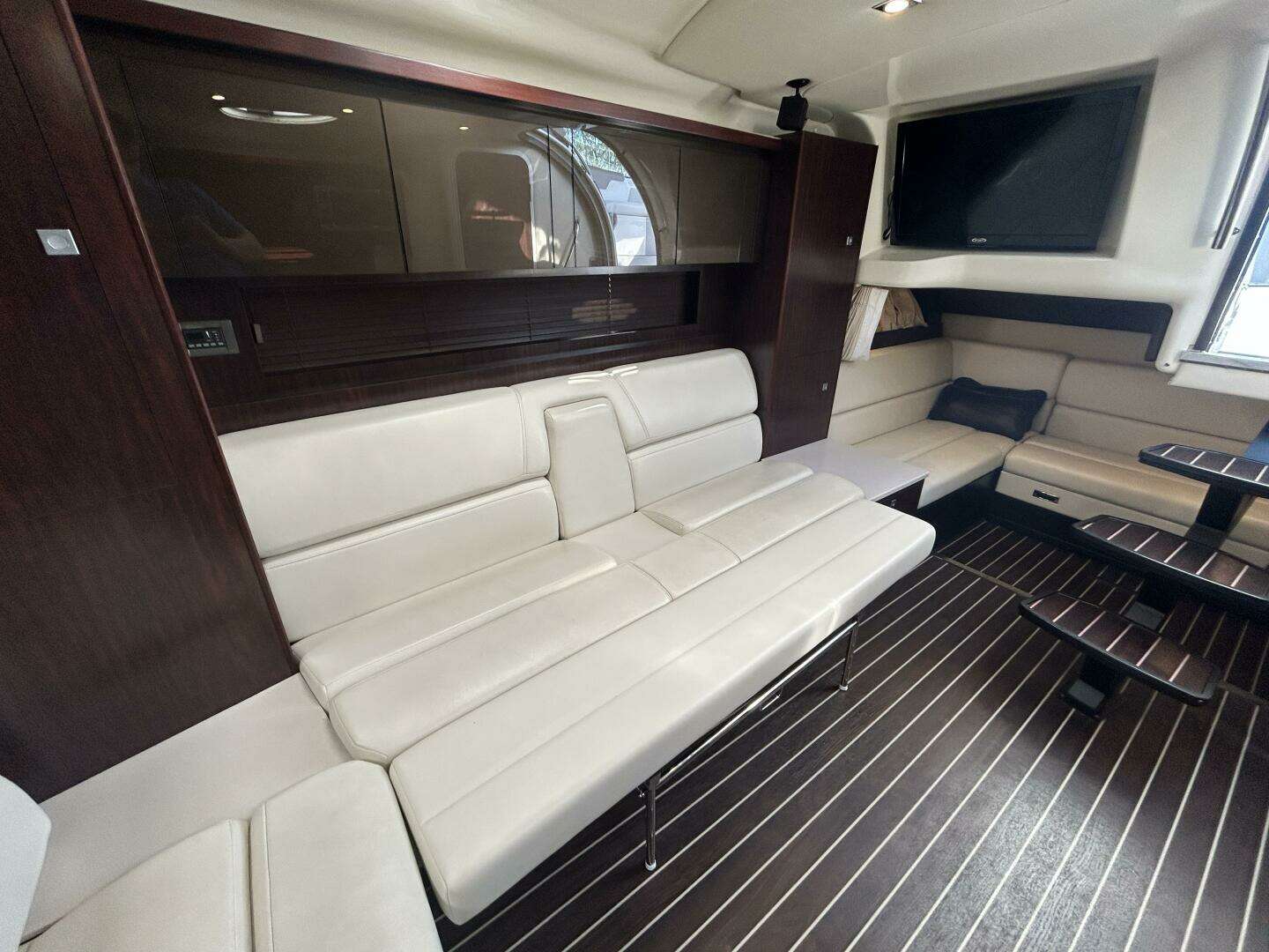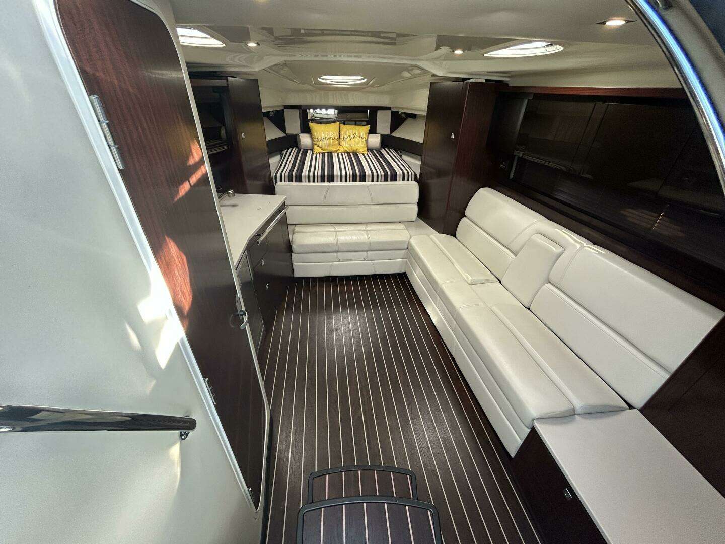 This yacht is tailored for all‑day enjoyment: a wet bar, and clever layout make serving friends effortless, while the hardtop and full enclosure provide shelter when needed without compromising sightlines or openness. The interior invites comfort — plush seating, subtle lighting, refined wood accents, and smart use of space create a cozy yet luxurious ambiance.