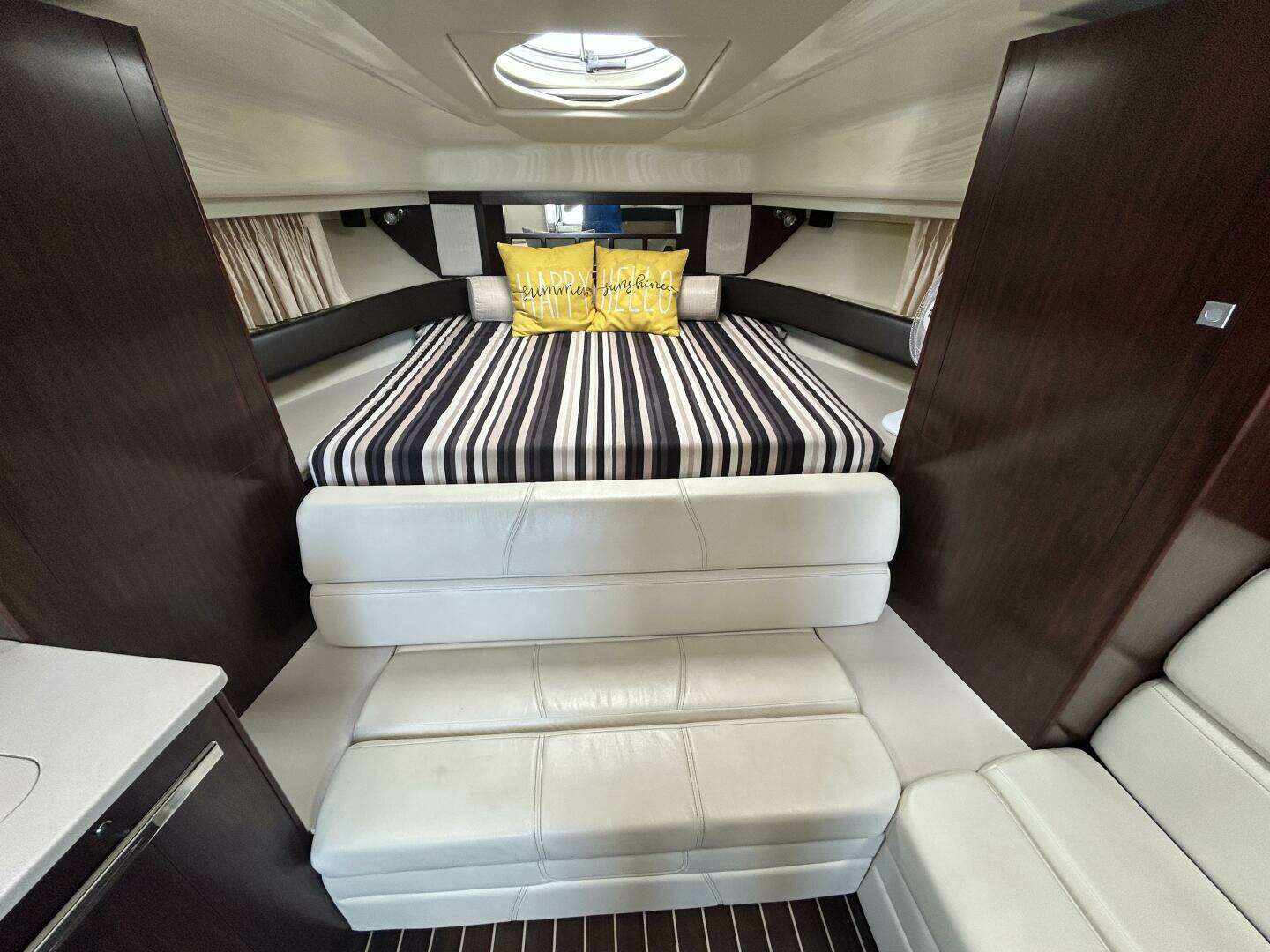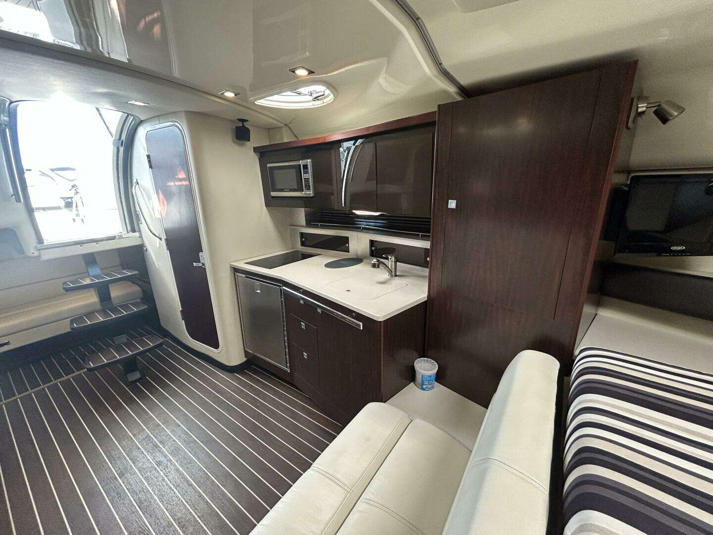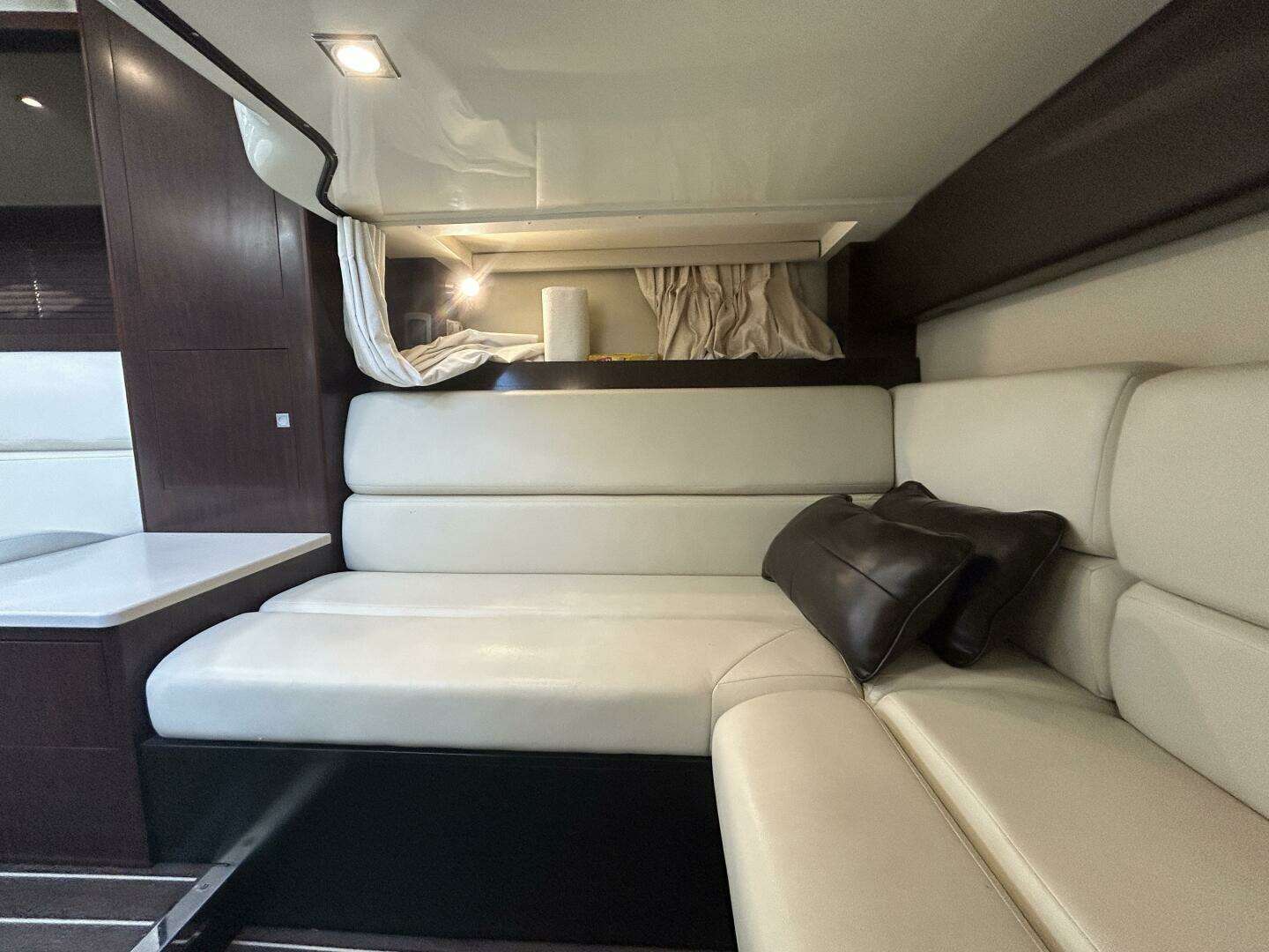 This yacht is tailored for all‑day enjoyment: a wet bar, and clever layout make serving friends effortless, while the hardtop and full enclosure provide shelter when needed without compromising sightlines or openness. The interior invites comfort — plush seating, subtle lighting, refined wood accents, and smart use of space create a cozy yet luxurious ambiance.