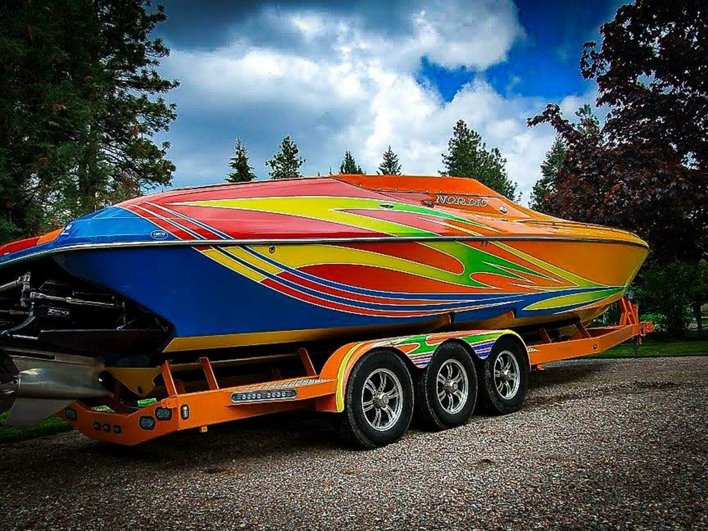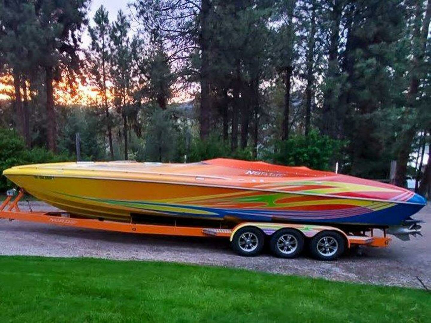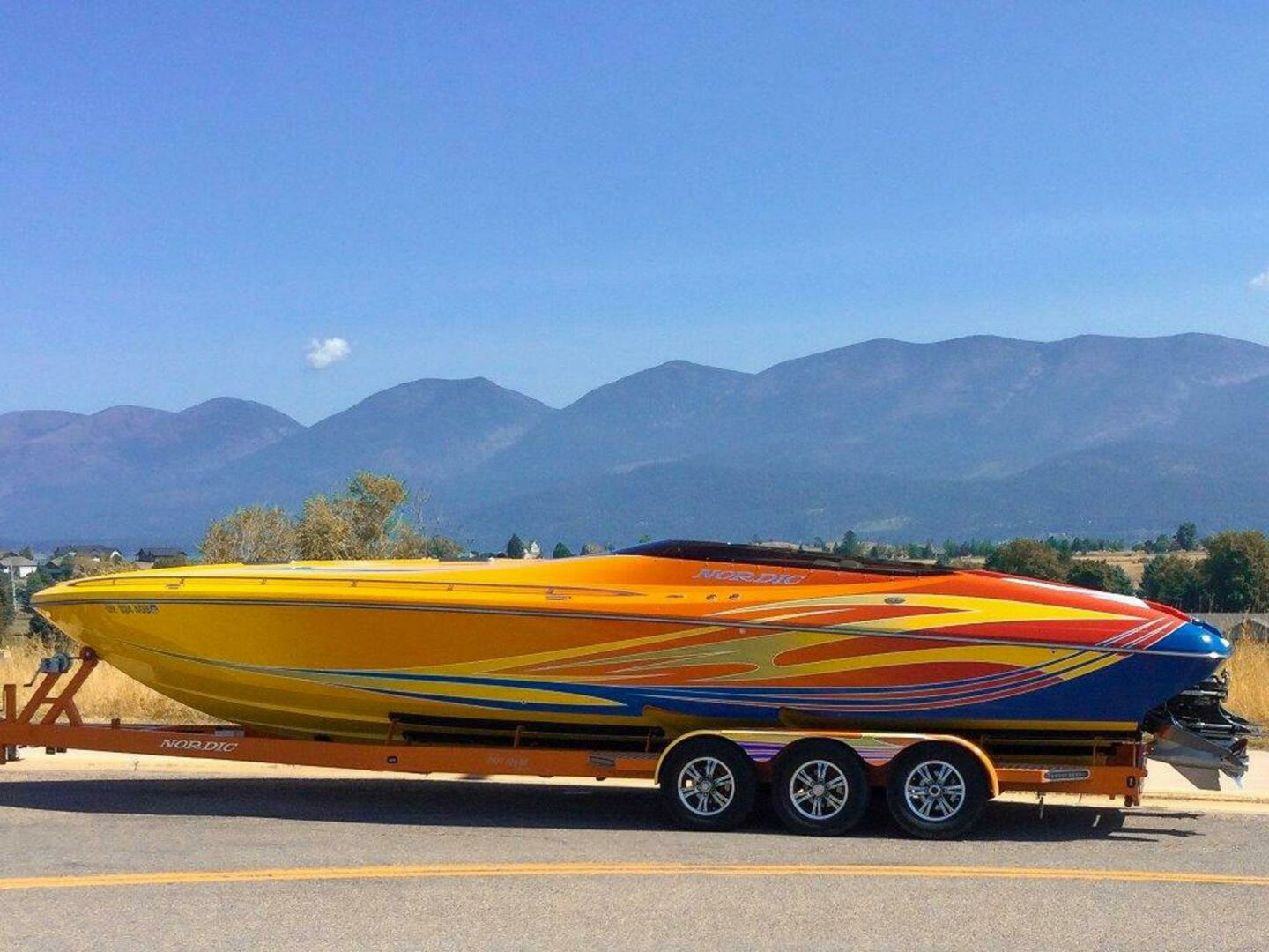 Introducing the 2009 35' Nordic Flame, a high-performance marvel that redefines the world of sport boating with Twin Paul Pfaff 725 Horsepower Motors, a staggering total of 1450 HP. Crafted to conquer, it can reach speeds up to 100 mph, all while running on readily available pump gas.