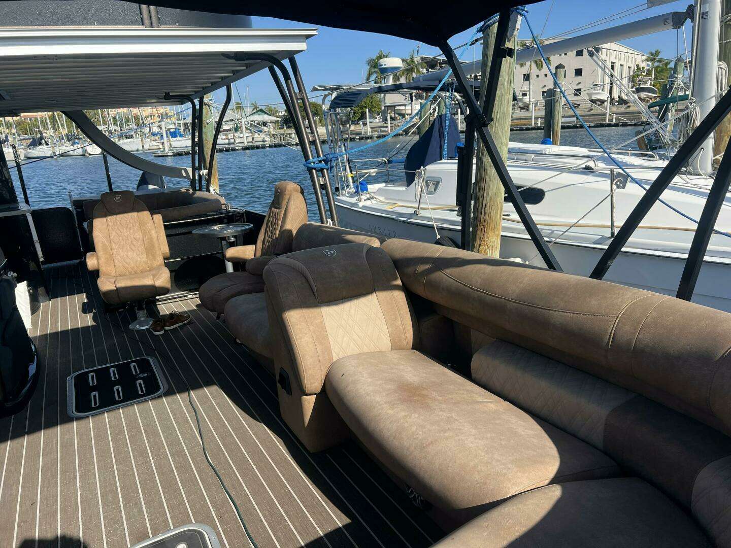 This highly upgraded 2023 Premier 330 Escalante combines luxury tri-toon cruising with serious performance. Powered by twin Suzuki 350 HP outboards and featuring Premier’s premium PTX Performance Package, this model delivers superior handling, stability, and acceleration compared to standard tri-toons.